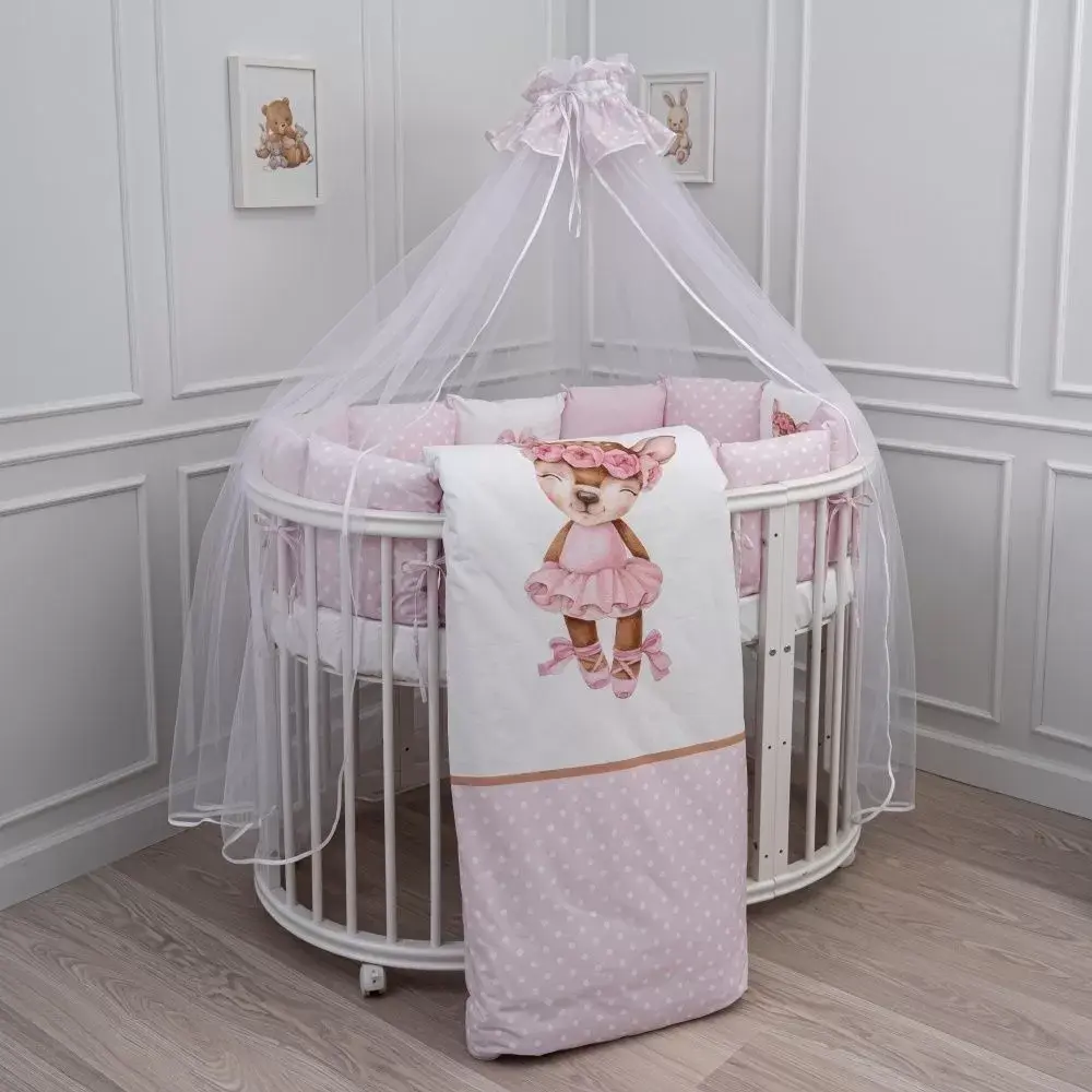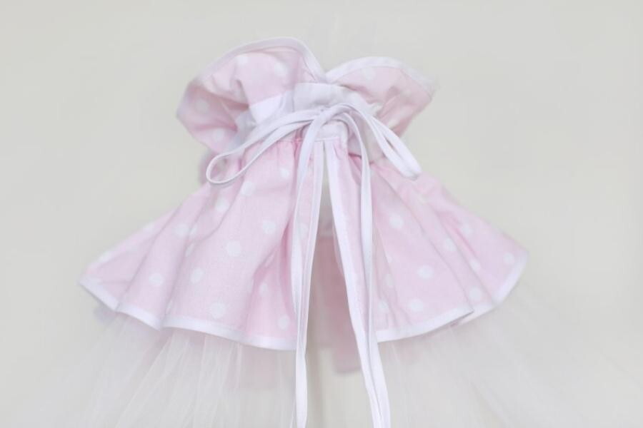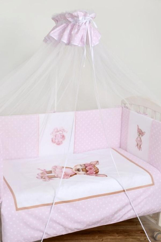 Балдахин в кроватку Балерина Lappetti 068. Воздушное изделие, выполненное из нежного фатина с юбочкой из тончайшего высококачественного поплинового полотна европейского качества, в расцветке коллекции "Балерина", дизайн которого разрабатывали команда ТМ Lappetti и талантливый художник-иллюстратор Tanya Bonya, что делают балдахин очень нарядным и уютным.