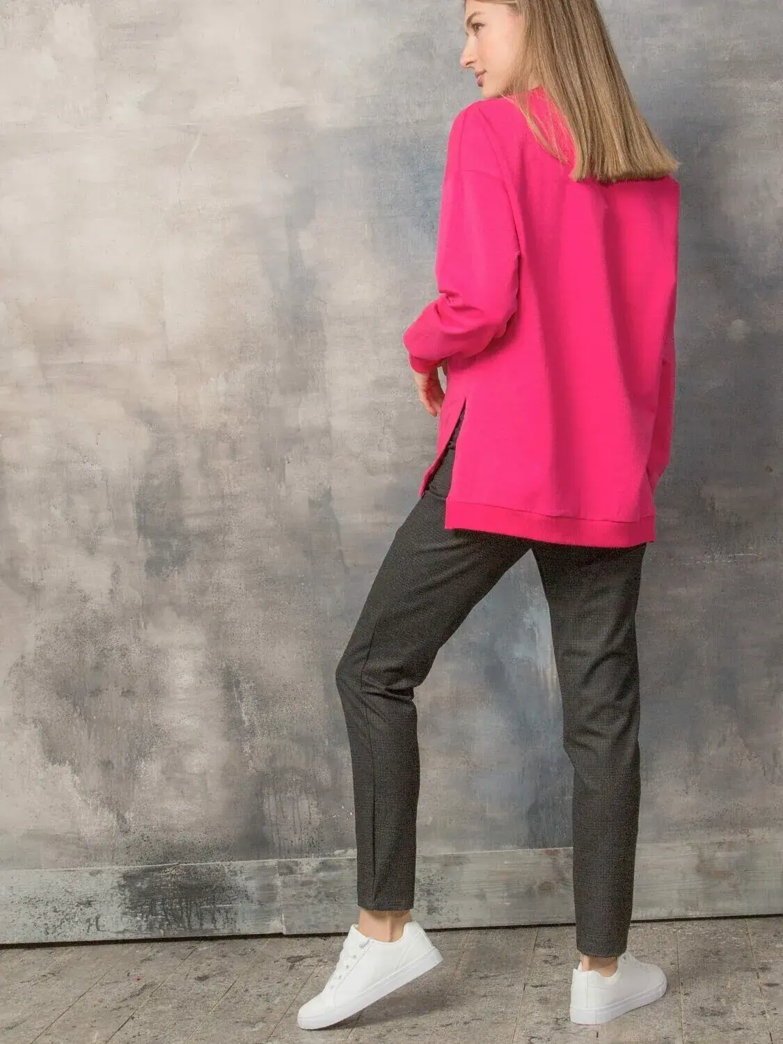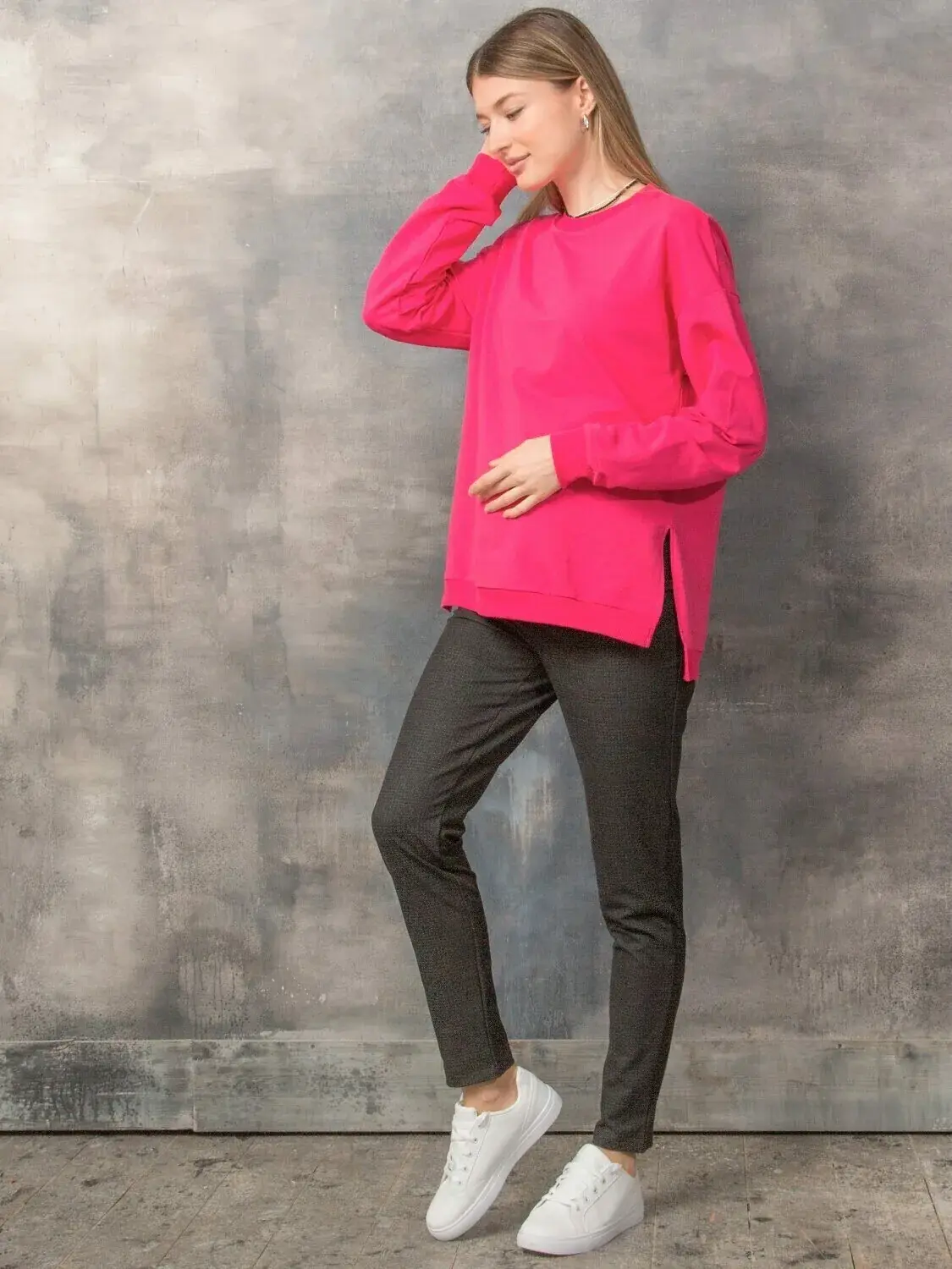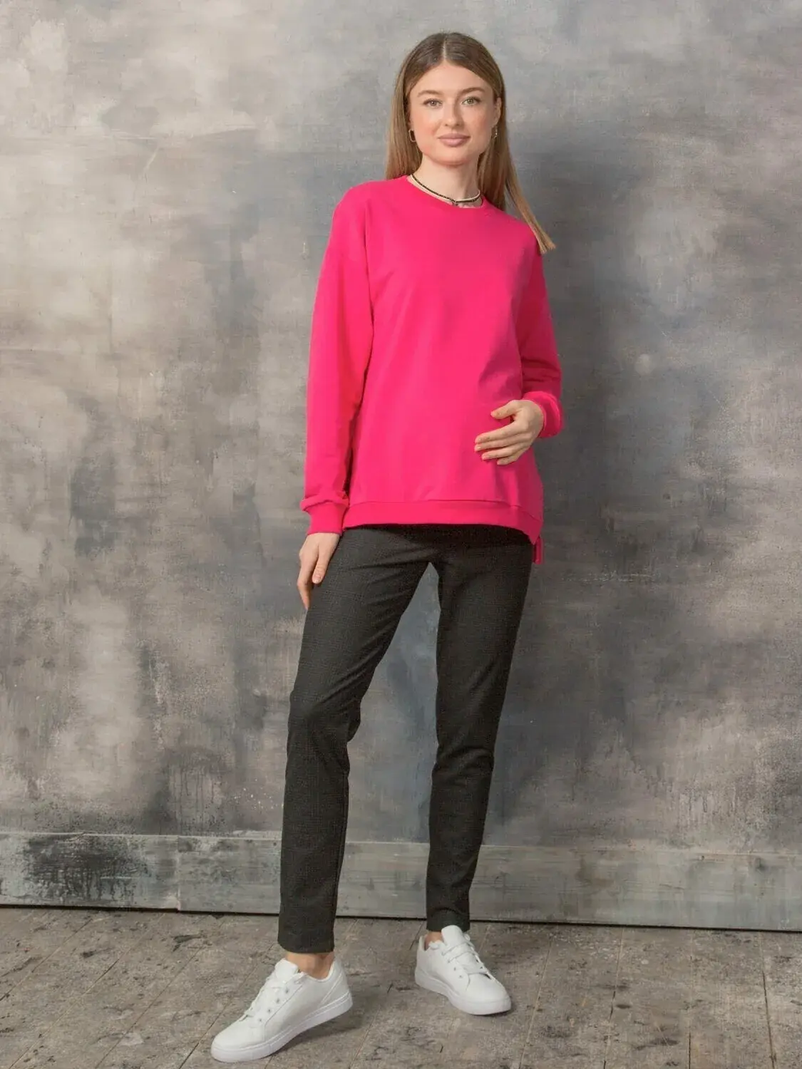 Хорошие комфортные брюки для беременных на демисезон. Ткань - классическая костюмная. Это мягкая, немного эластичная и красивая ткань. Брюки слегка зауженные книзу (не узкие), разрезные, с имитацией карманов спереди и сзади. Брюки полной длины, рассчитаны на рост 170 см. Хорошо садятся по любой фигуре. Высокая вставка на живот мягкая и эластичная. Пояс в виде эластичной резинки регулируется по мере роста живота.