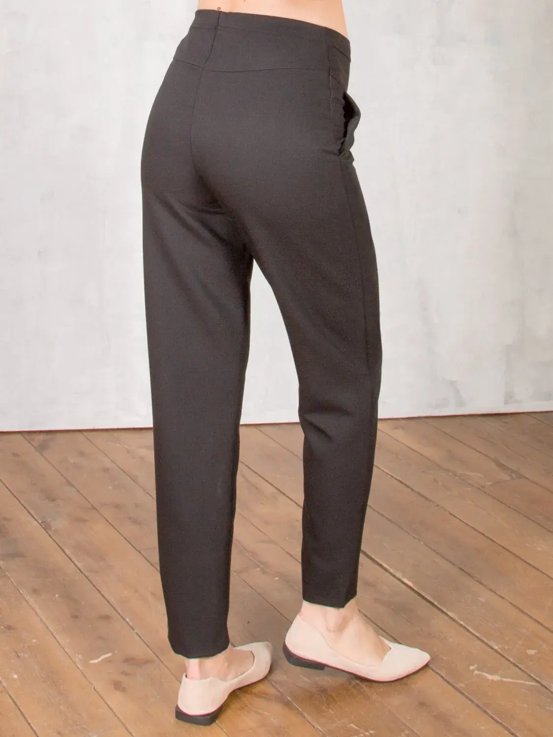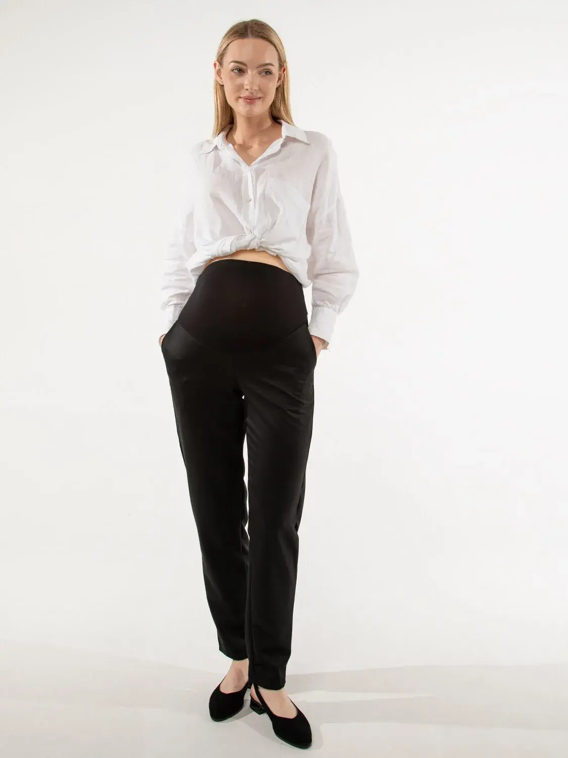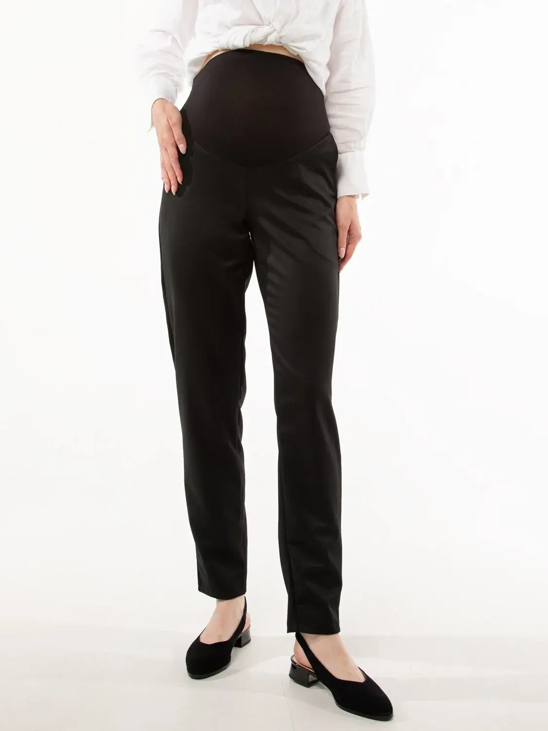Брюки-бананы для беременных из эластичной костюмной ткани. Подходят для прохладной погоды. Брюки слегка раширены в зоне бедра и сужены книзу (бананы). Брюки слегка укороченные, 7/8 длины при росте 170 см. Есть функциональные передние карманы. Спинка с кокеткой высокая. Спереди есть эластичная вставка на растущий живот, пояс которой регулируется резинкой.