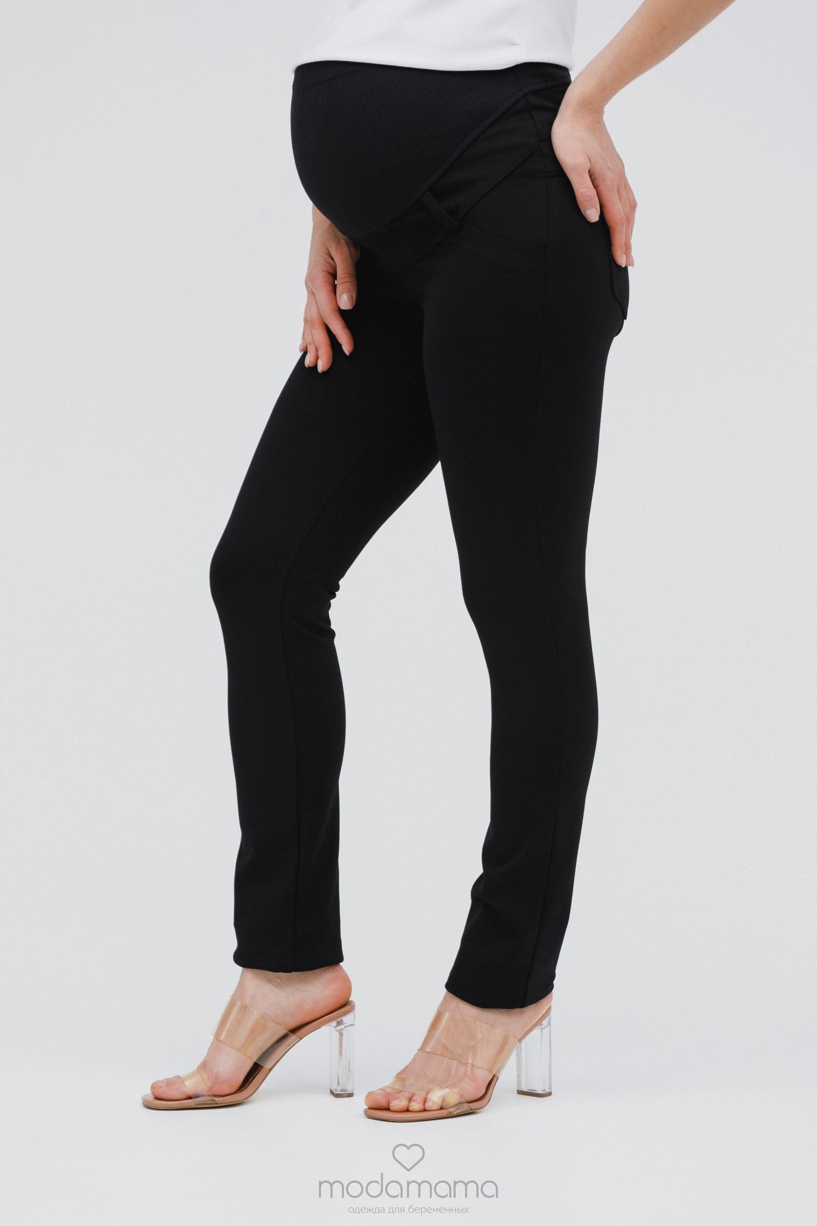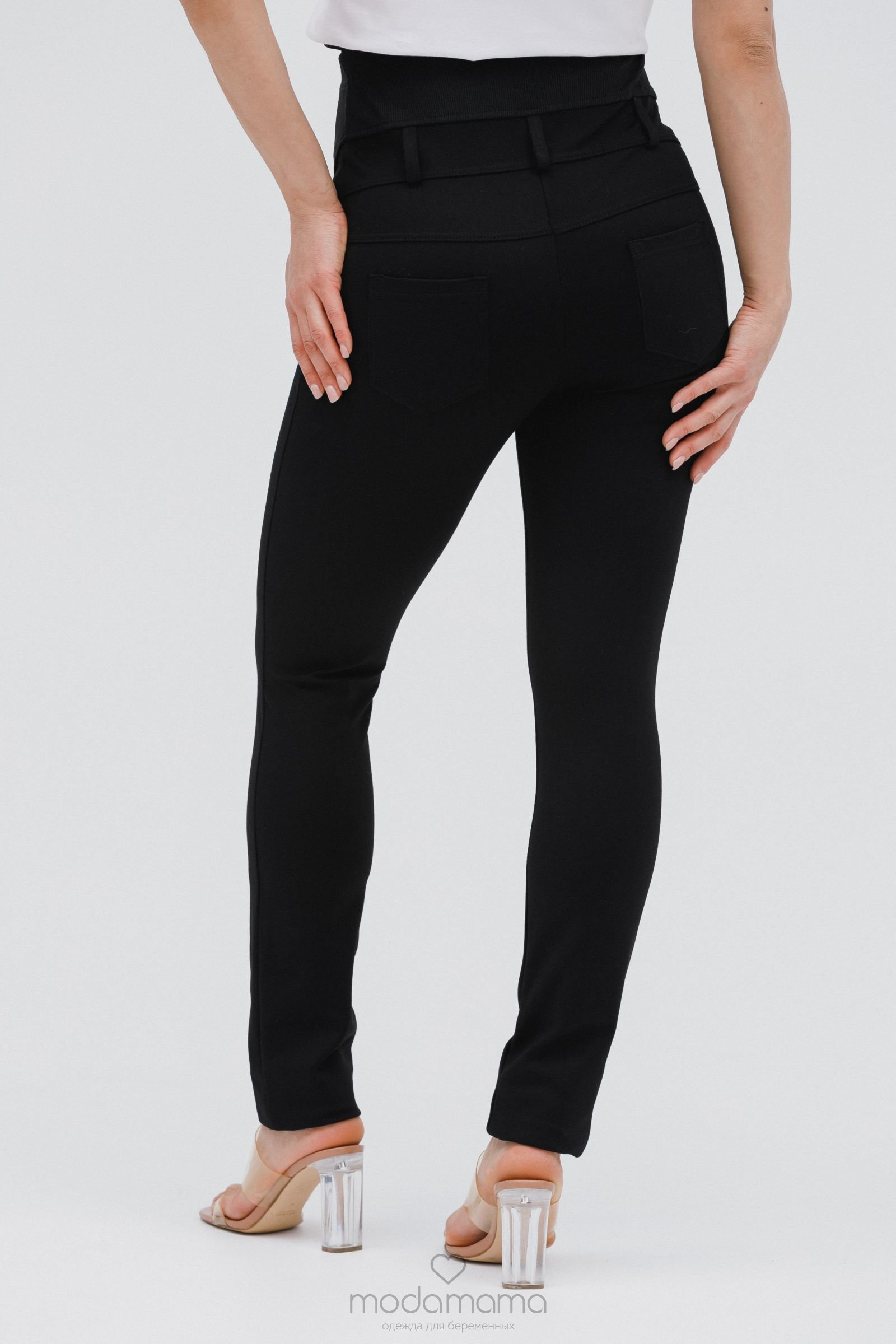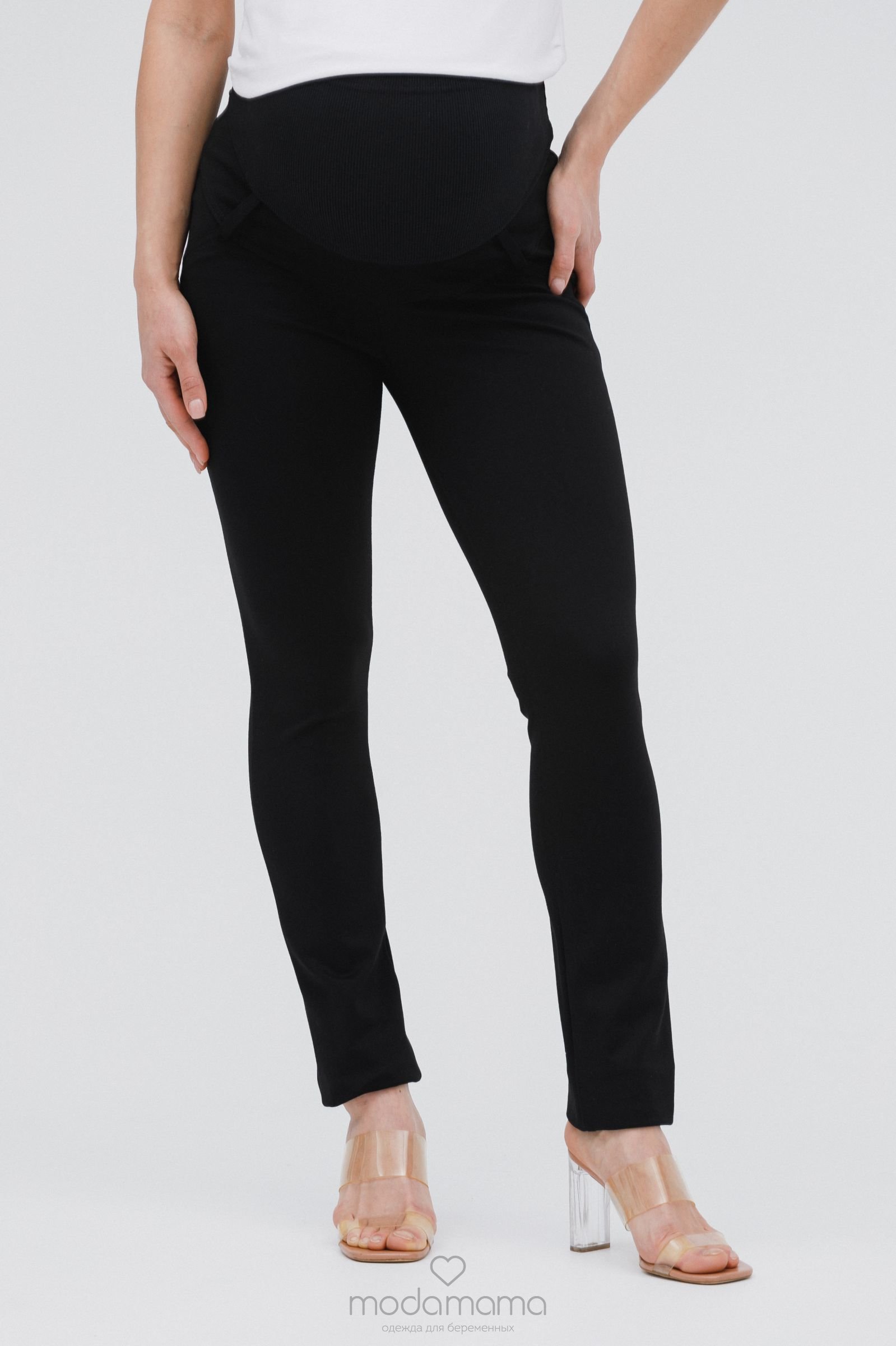 Узкие брюки для беременных из брючной, трикотажной ткани. Спереди трикотажный бандаж с удобной регулировкой по верху. Задние карманы с отделкой. Идеальная посадка брюк обеспечит комфорт во время беременности. Хорошо сочетаются с блузками и туниками.