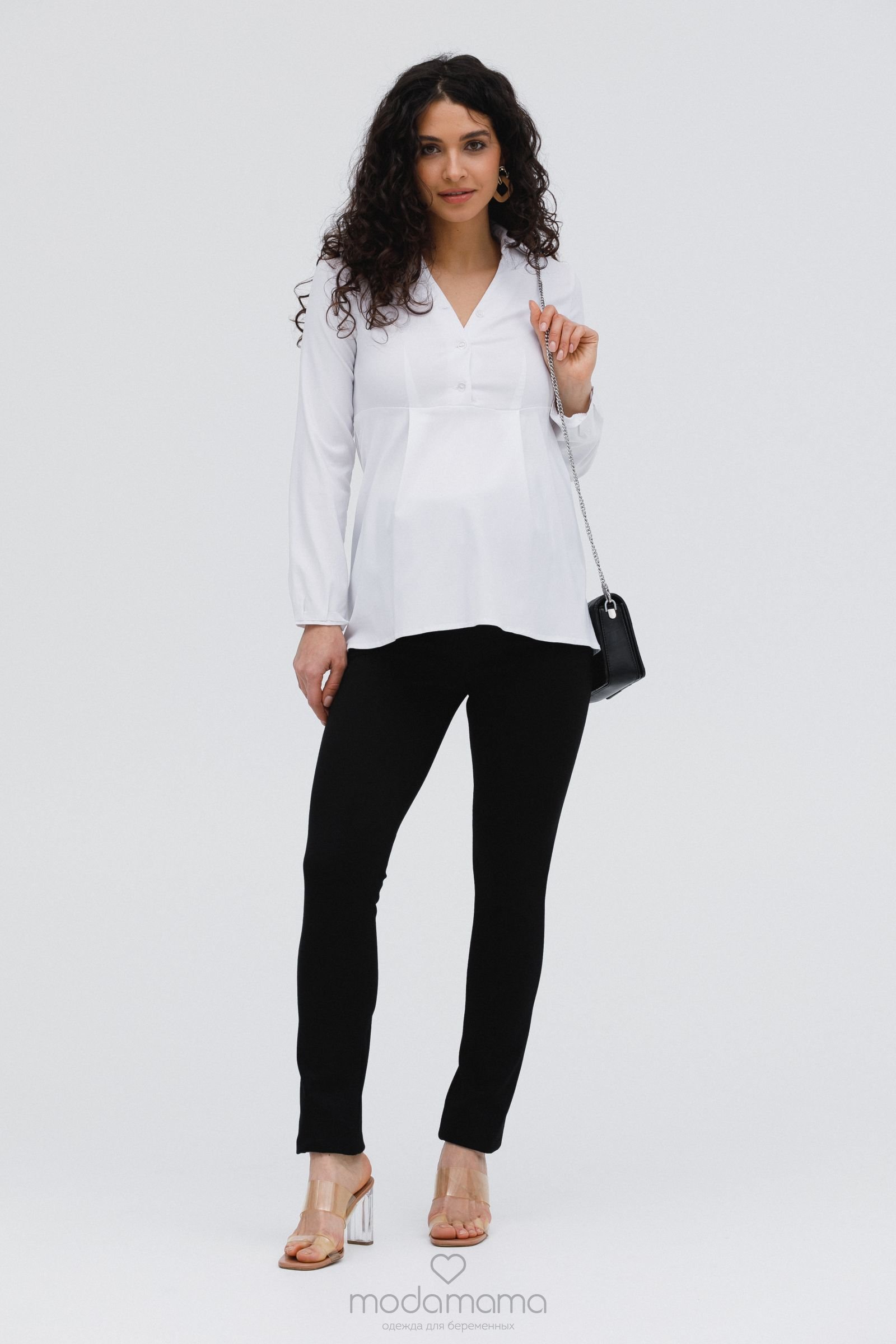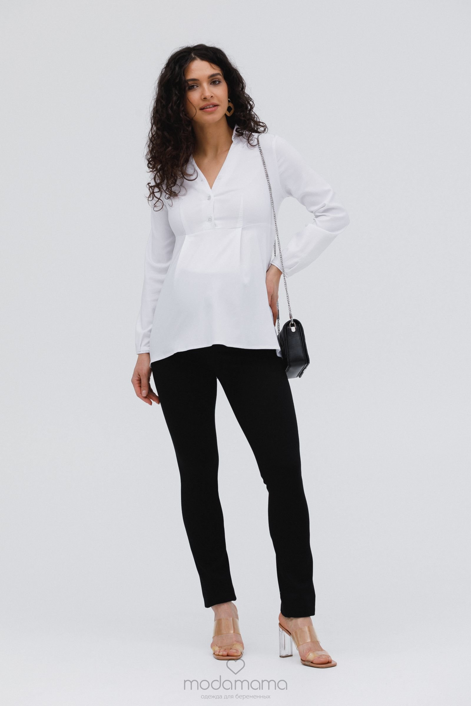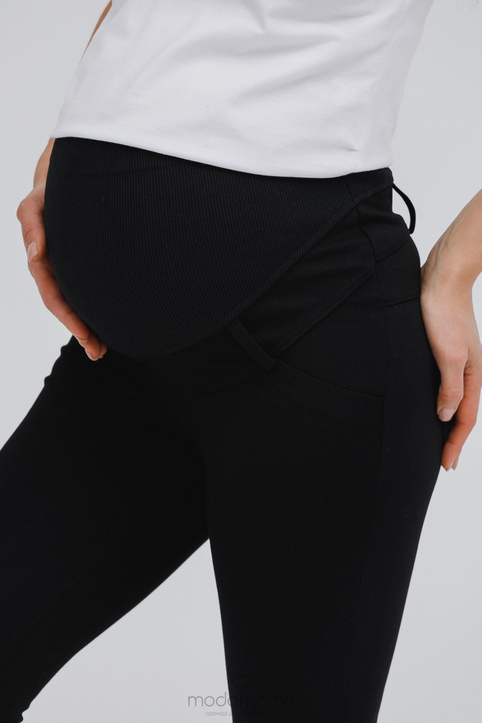 Узкие брюки для беременных из брючной, трикотажной ткани. Спереди трикотажный бандаж с удобной регулировкой по верху. Задние карманы с отделкой. Идеальная посадка брюк обеспечит комфорт во время беременности. Хорошо сочетаются с блузками и туниками.