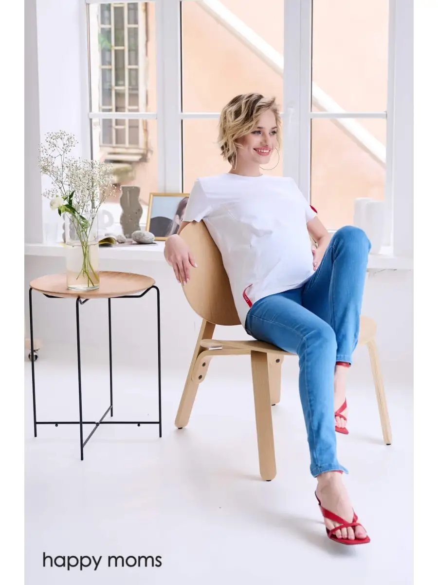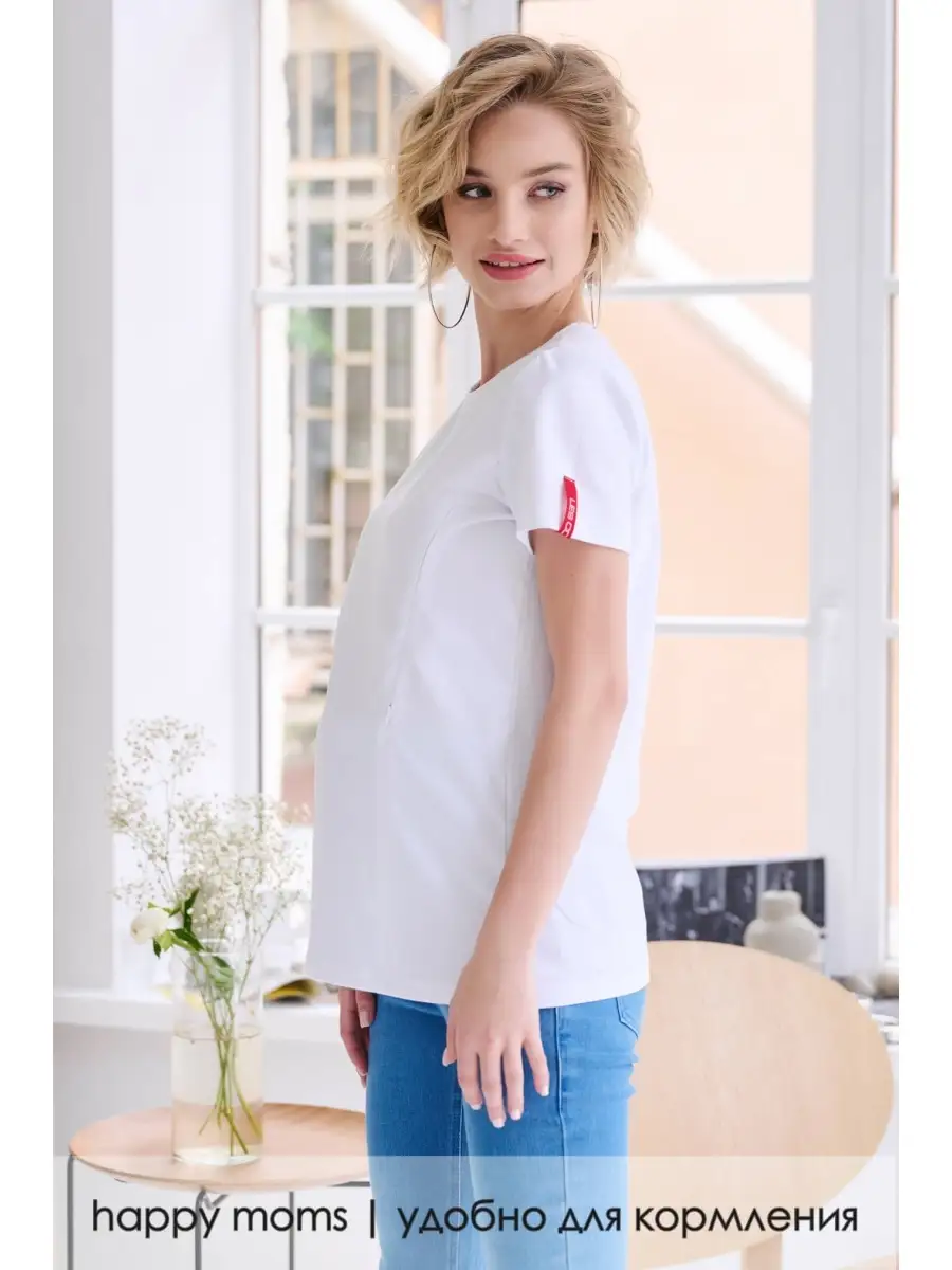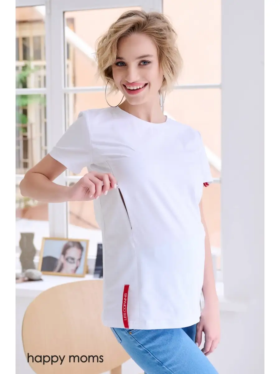 Футболка для беременных женщин длиной до середины бедра. Представлена в нескольких оттенках. Классическая базовая модель, удобная для повседневной носки. Дышащая ткань, аккуратная круглая горловина, свободные короткие рукава. Оригинальный акцент в виде красных нашивных этикеток на рукаве и по низу полочки. Просторный силуэт позволит надевать футболку на любом сроке беременности и после родов.
