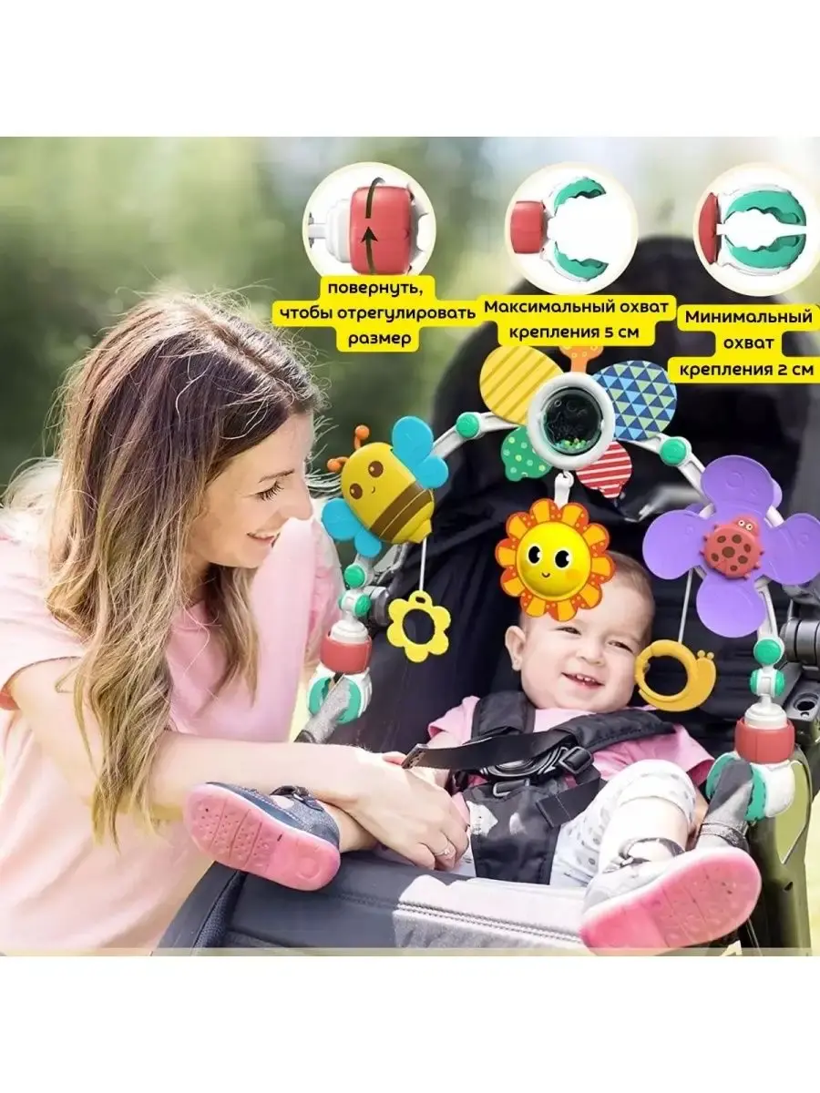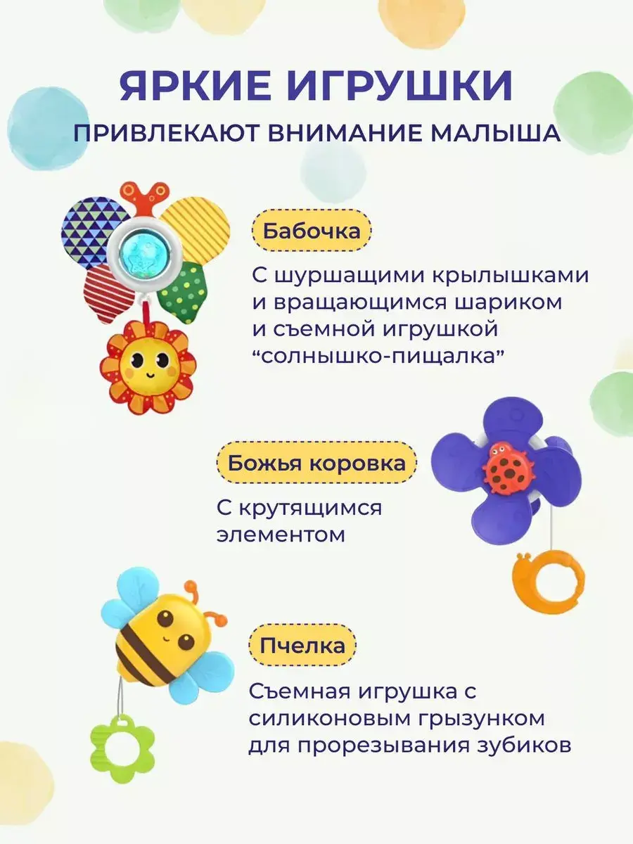 зеркало, пищалка, погремушка, прорезыватель, тактильные вставки, шуршащие и хрустящие элементы