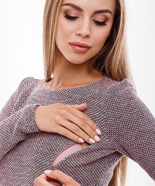Облегающий джемпер для беременных и кормящих из теплого трикотажа букле. Минималистичный силуэт делает эту модель трендовой, а секрет для кормления в виде двух потайных молний в нагрудных рельефах — удобной и многофункциональной.