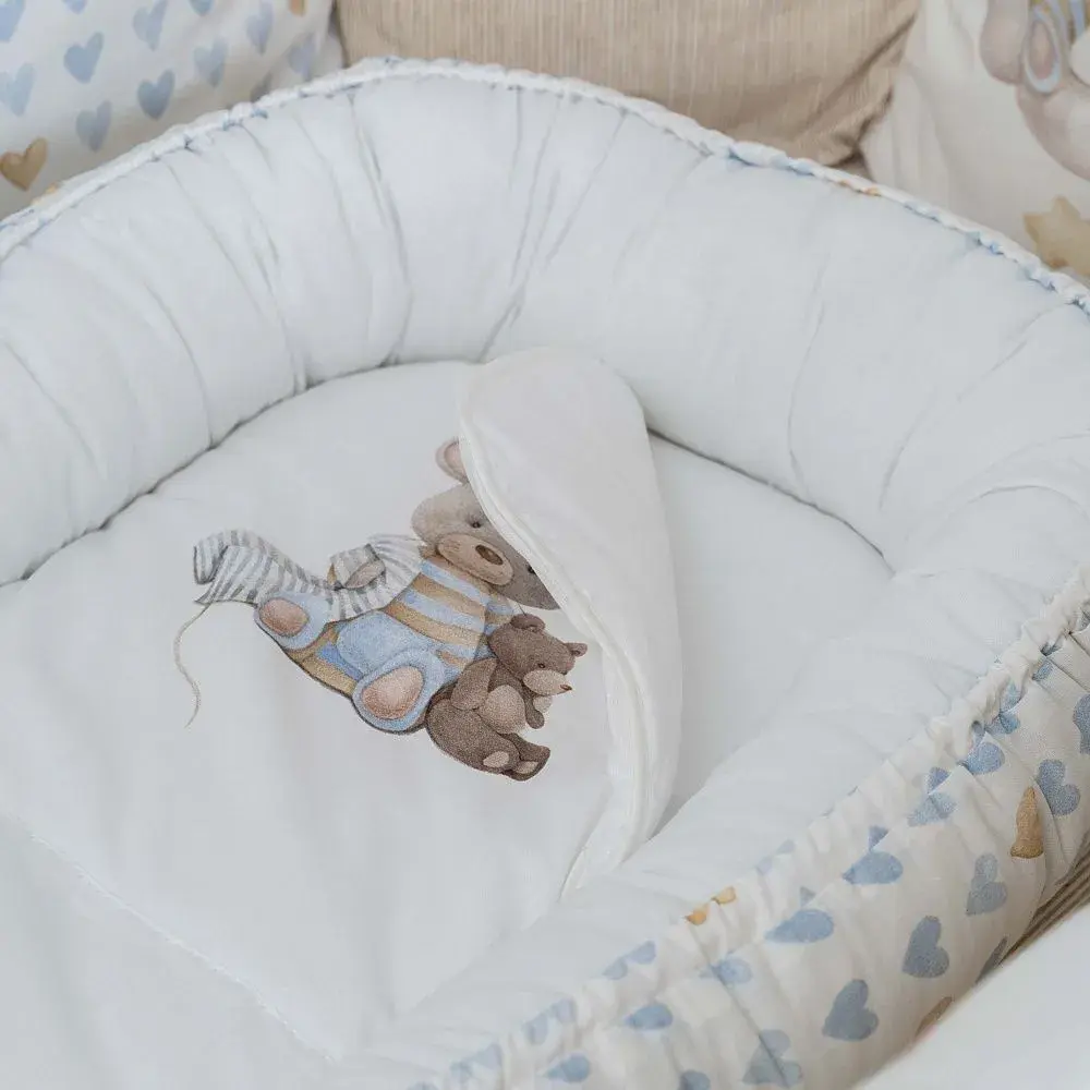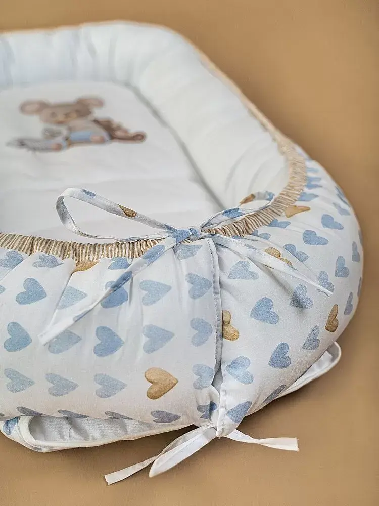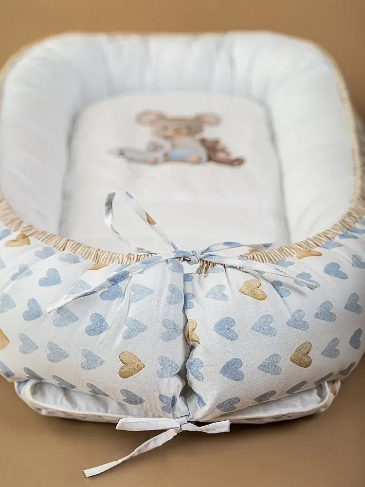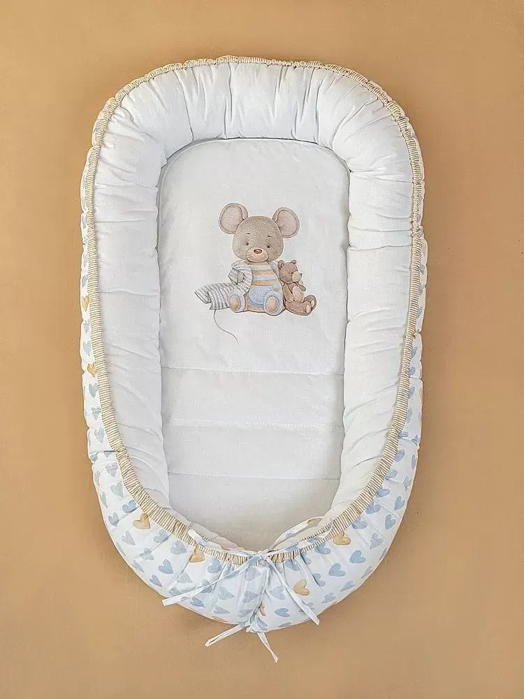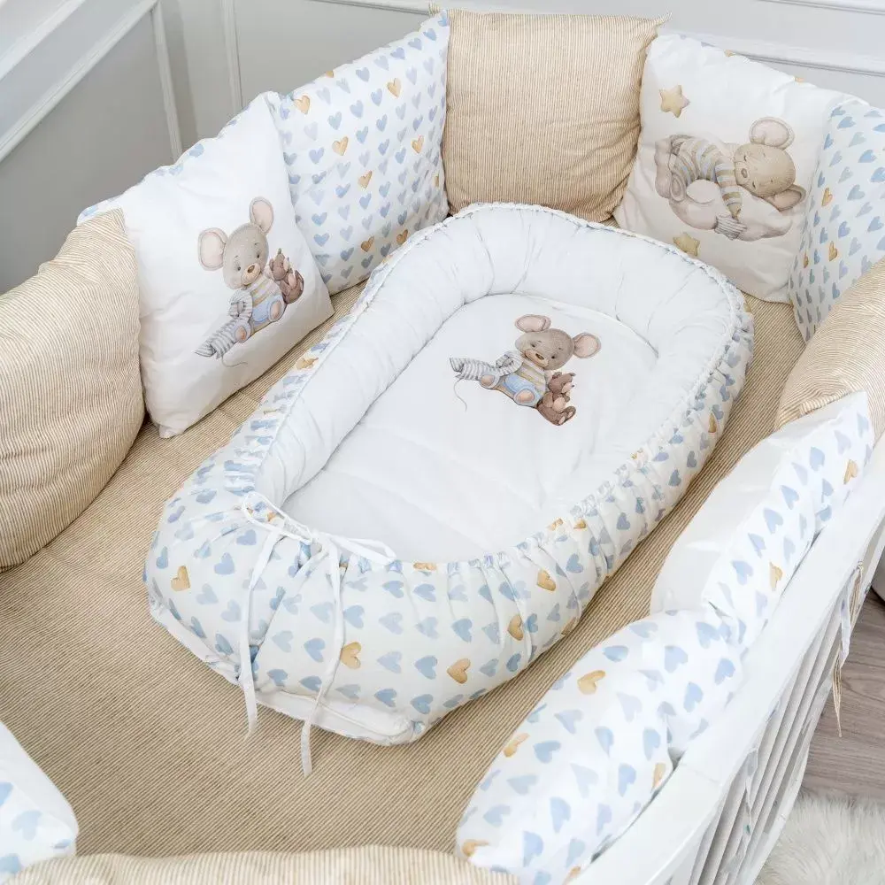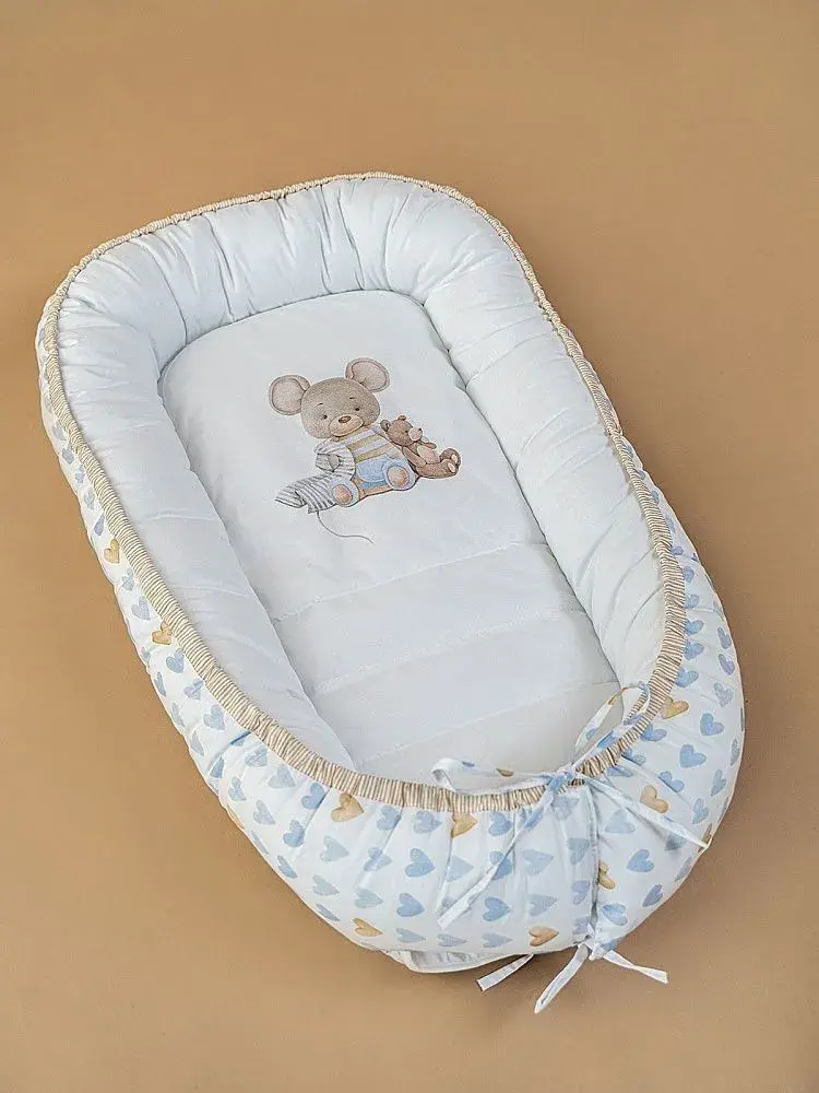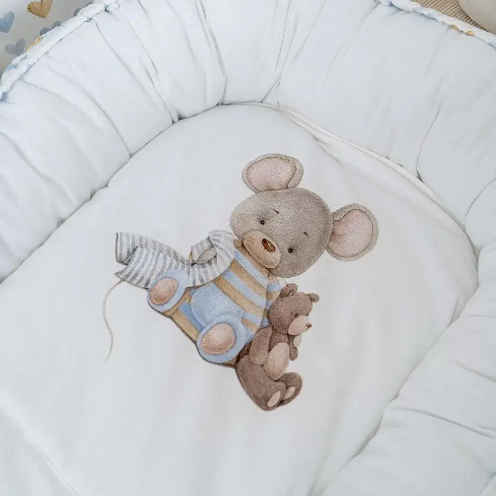 Ткань поплин, 100% хлопок, наполнитель холлкон, ПЭ 100%. Размер 75х45 см. С дополнительным вынимающимся матрасиком с изображением мышки. Идеально подходит к комплектам в кроватку из коллекции Мышки на облачке