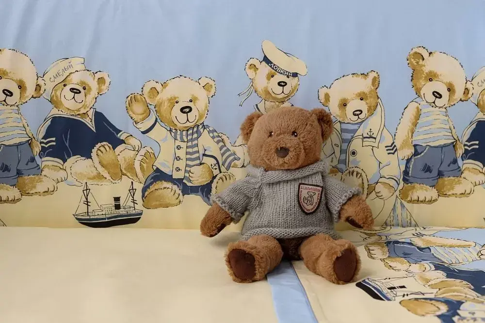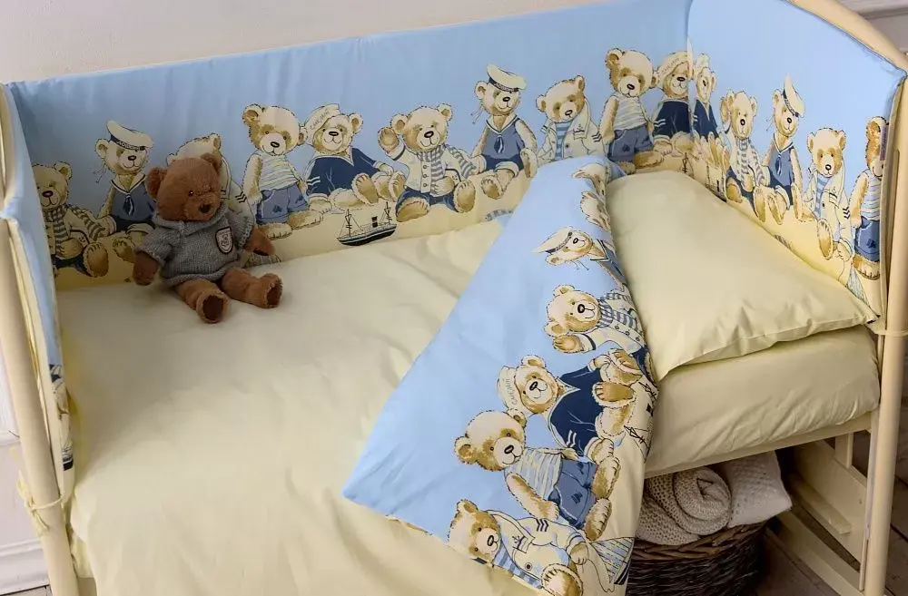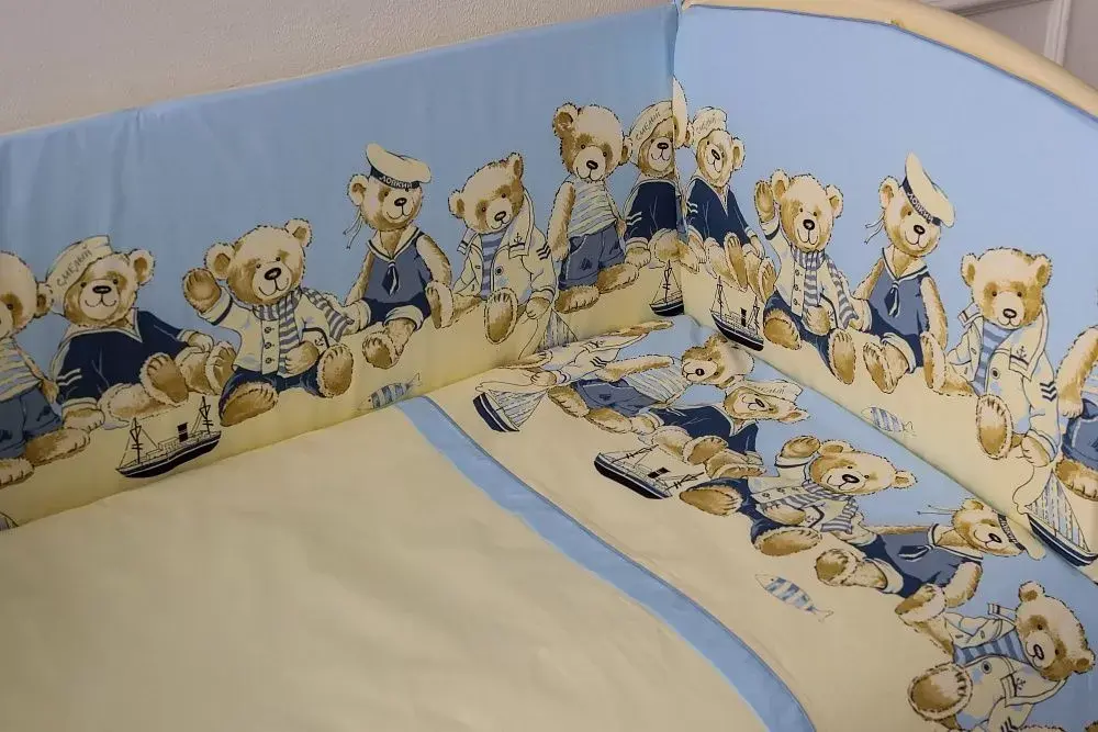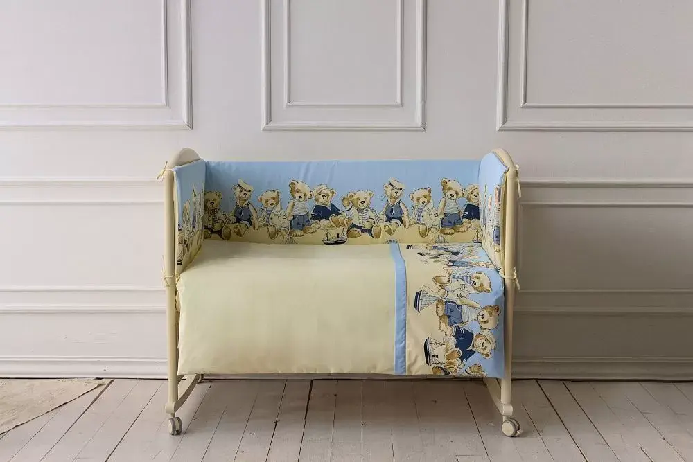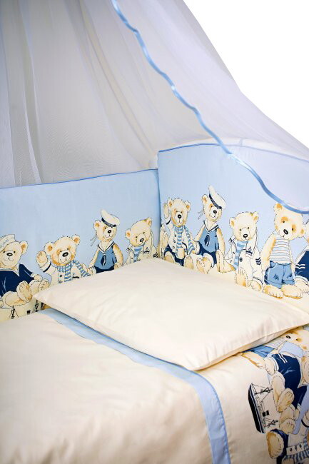 Lappetti Морячки – набор постельного белья для детской кроватки, украшенный красивым рисунком в виде плюшевых мишек-морячков. Для изготовления постельных принадлежностей использовался высококачественный сатин. Это 100% натуральный материал, обеспечивающий приятные тактильные ощущения, а также отличающийся высокими гигроскопичными и гигиеническими свойствами. Бортик наполнен холлконом, а подушка и одеяло – холлконом и бамбуковым волокном, которые представляют собой антиаллергенные материалы.