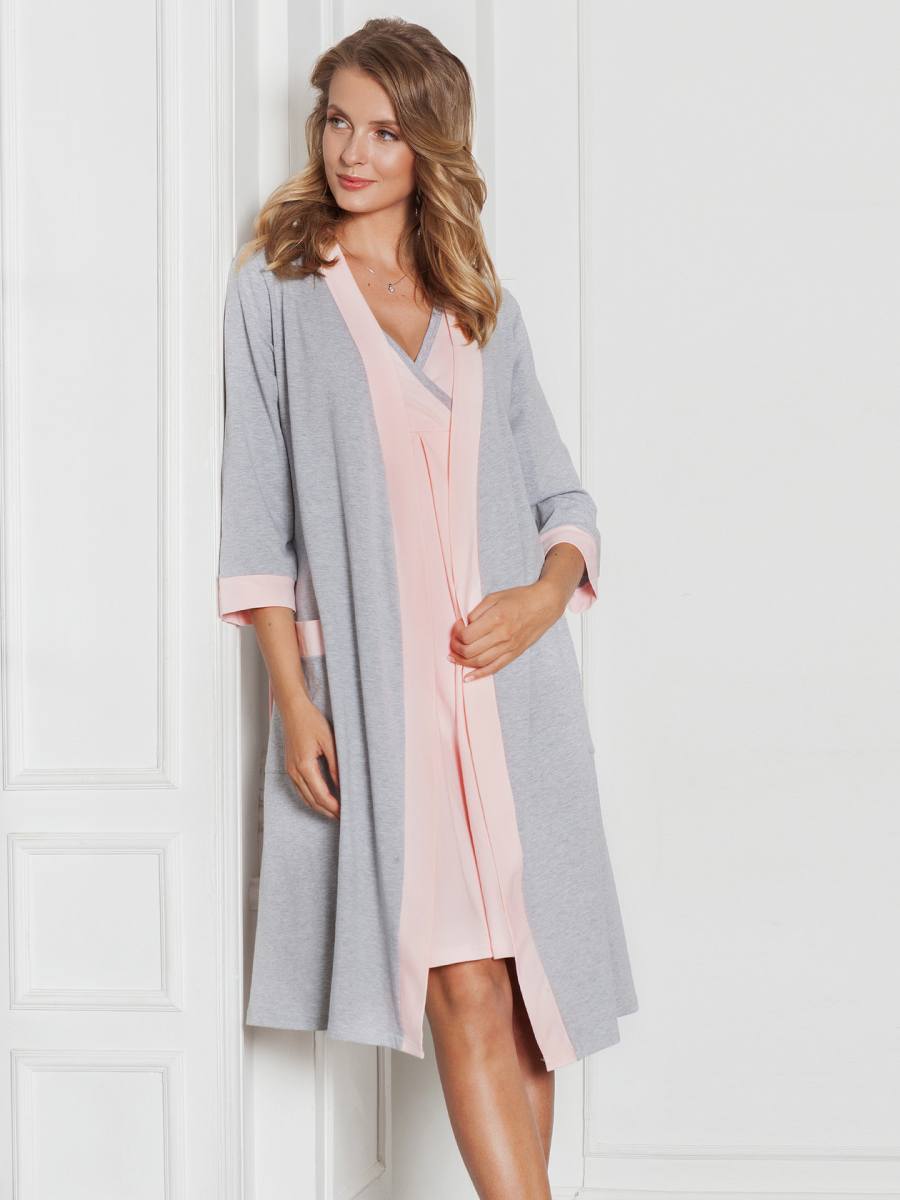 Комплект выполнен из гипоаллергенного хлопкового полотна с добавлением эластана и представлен в различных оттенках. Халат имеет дополнительную завязочку с внутренней стороны по линии талии, благодаря чему халат не распахивается при носке. Сорочка имеет мягкий расклешенный силуэт, образованный за счет встречной складки на уровне линии талии под грудью, что обеспечивает нежное облегание растущего животика. Длина сорочки по спинке: 96 см