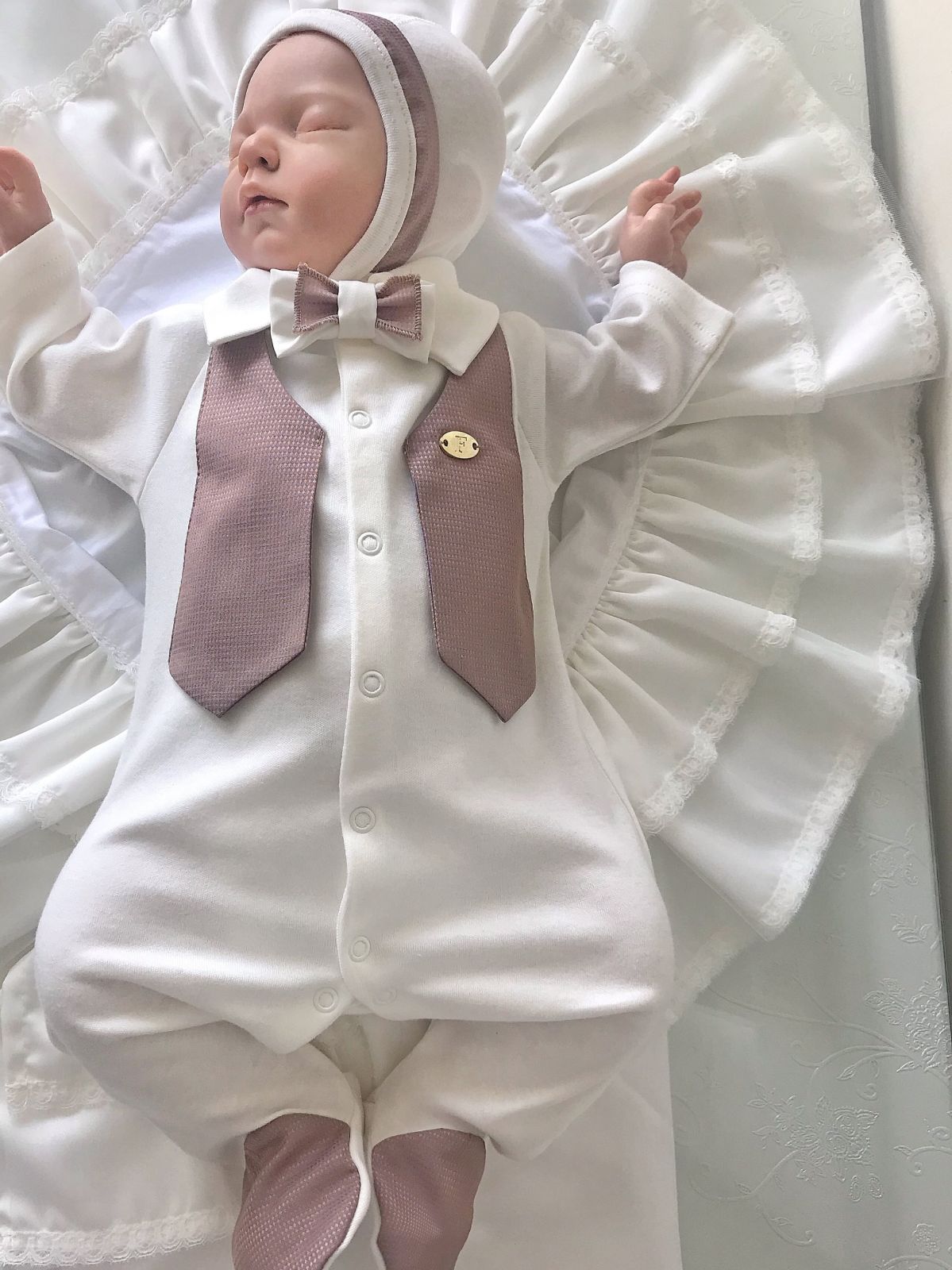 Трикотажный комбинезон молочного цвета с элегантным воротничком. Расстегивается по всей длине. Жилетка цвета шоколад . Бабочка пришита. Чепчик украшен жаккардовой тканью.