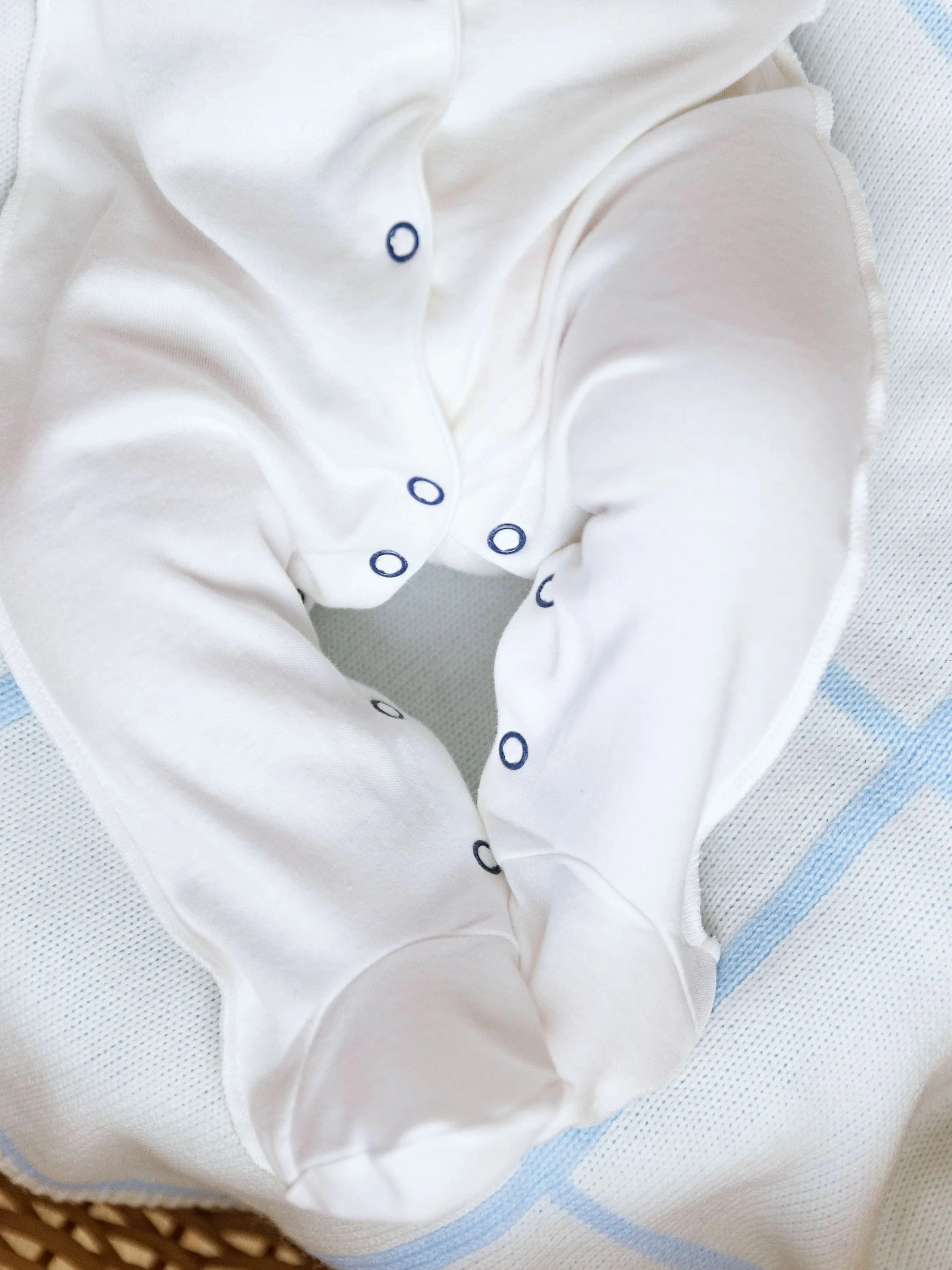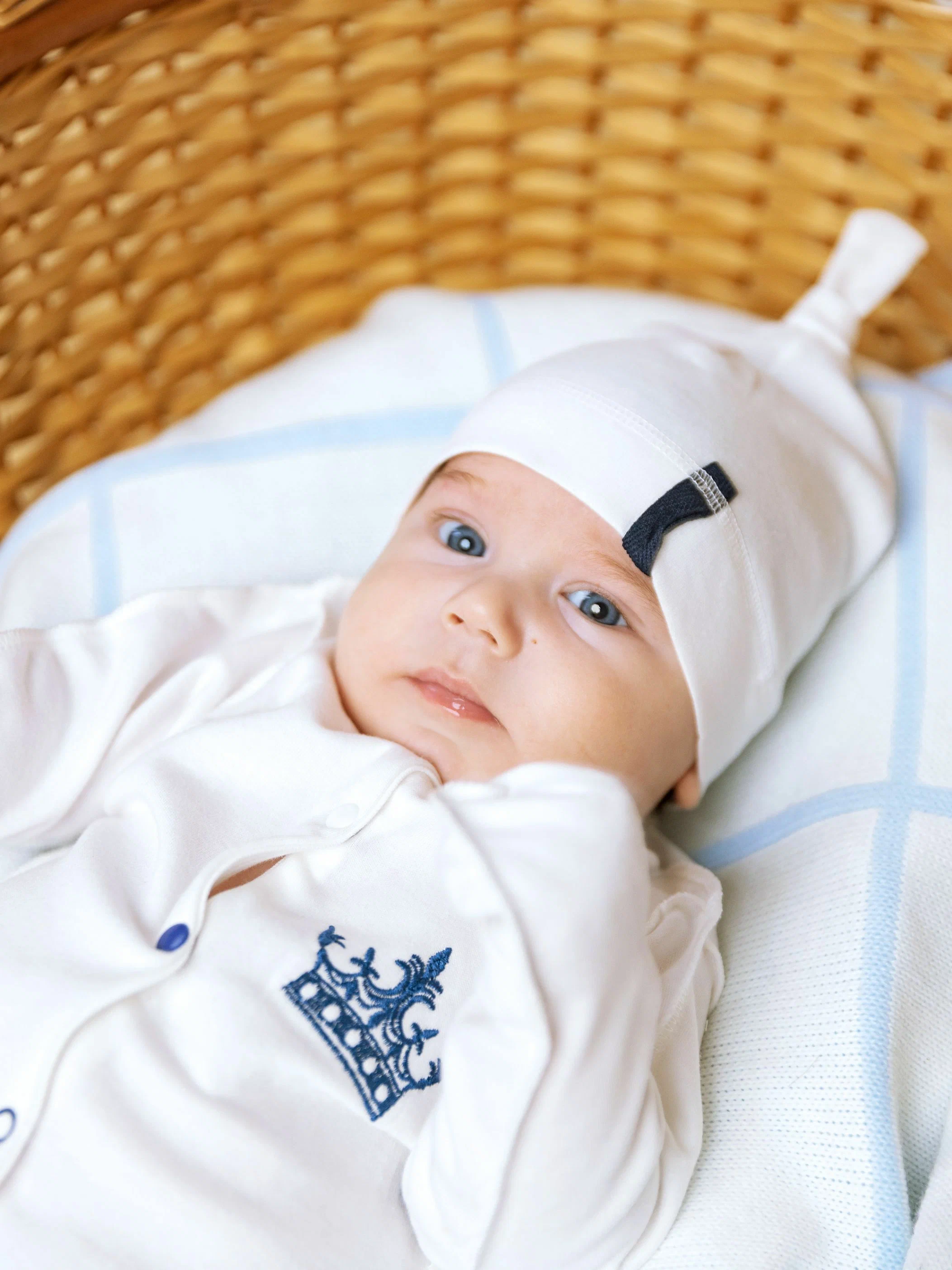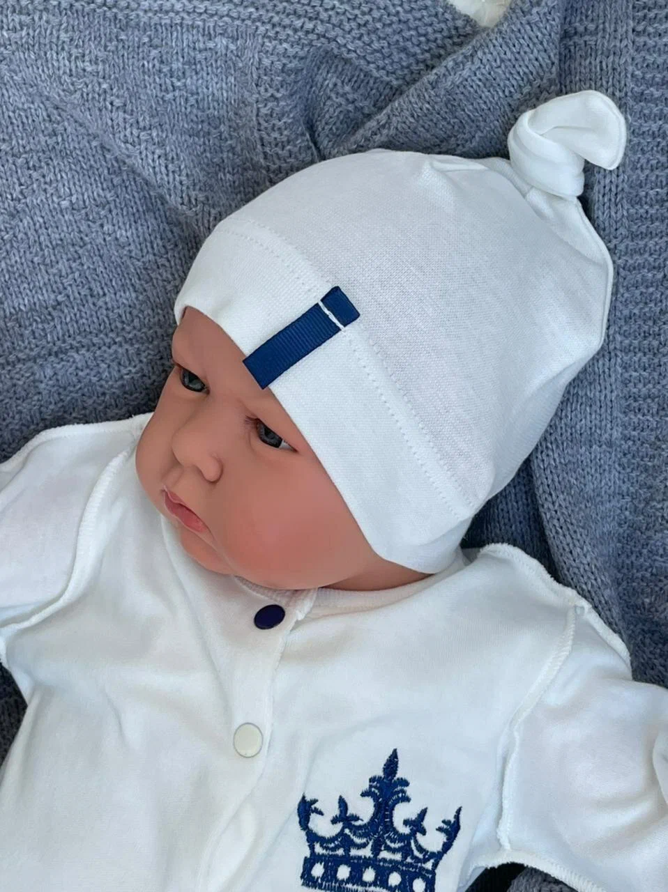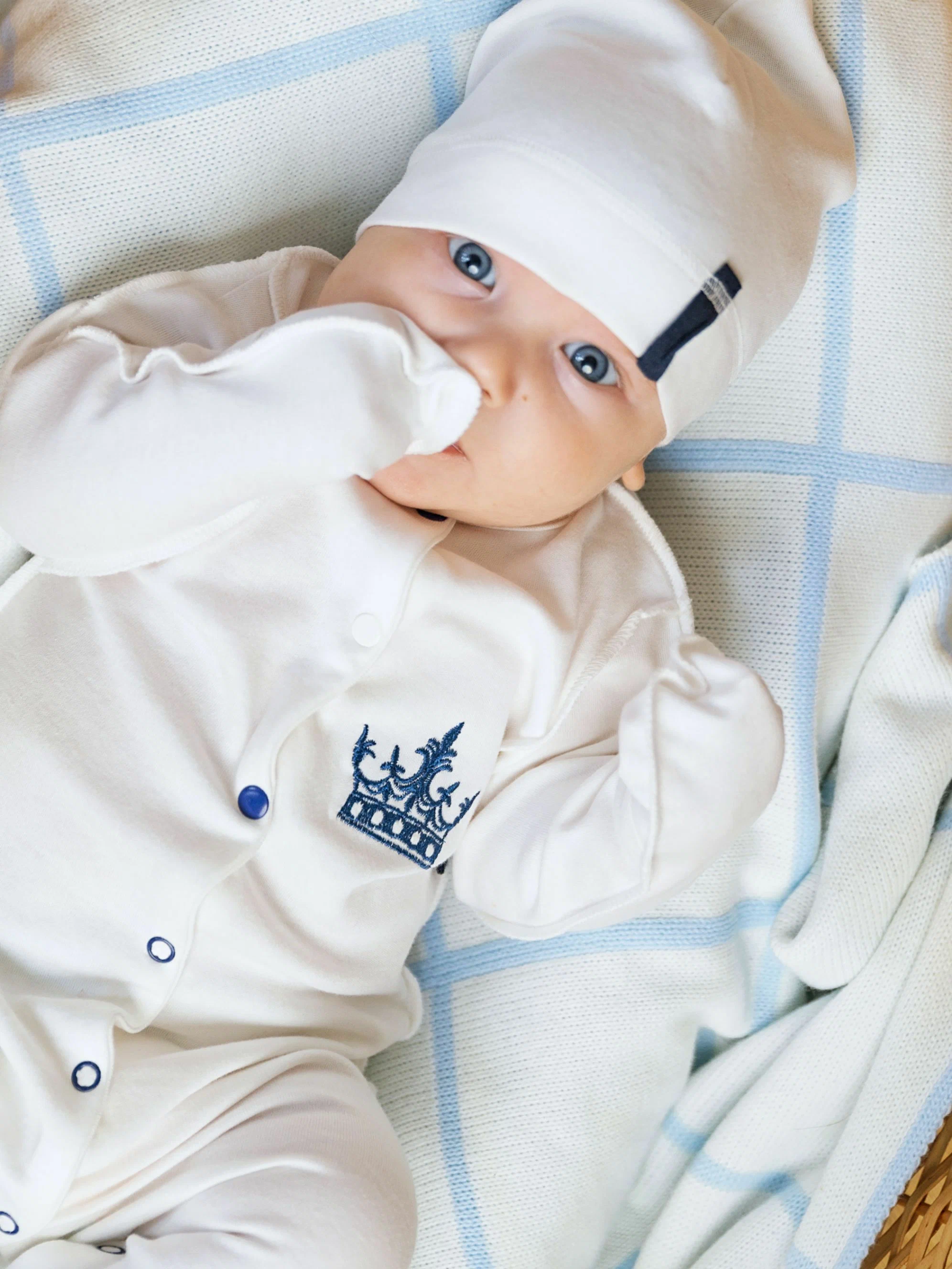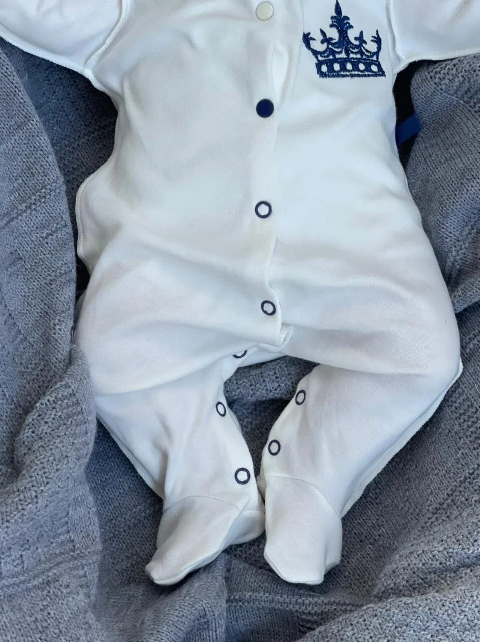 Комплект для новорожденного мальчика (комбинезон и шапочка без завязок) с синей короной
