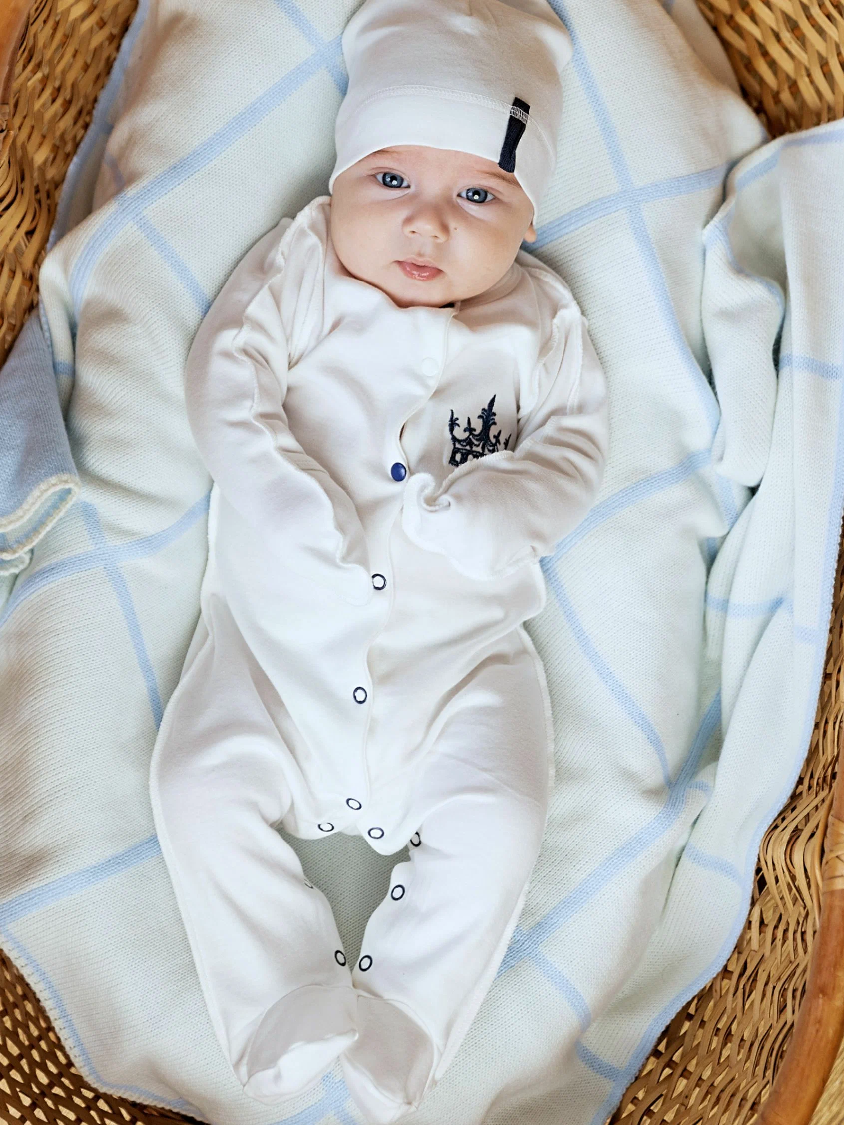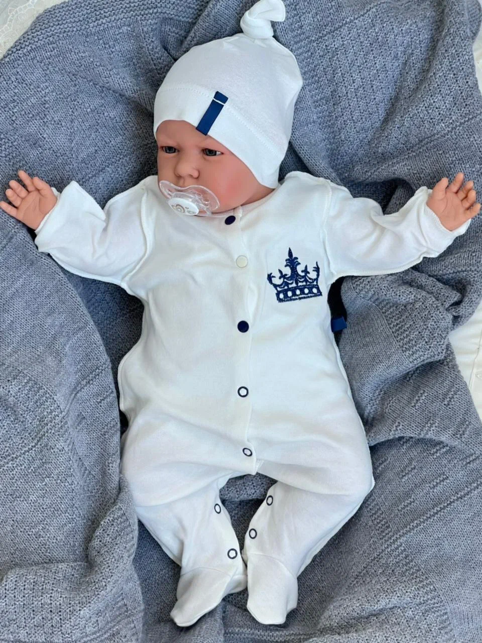 Роскошный комплект из мягкого трикотажа для настоящего принца. Состоит из комбинезона и чепчика. Выполнен швами наружу. На рукавах защитные антицарапки, которые можно отвернуть и использовать изделие с открытым рукавом. Комбинезон украшен спереди вышивкой в виде серой короны. Шапочка украшена серой лентой. Комбинезон  удобно полностью застёгивается на кнопочки. Чепчик на завязках. Отлично подойдёт на для выписки из роддома.