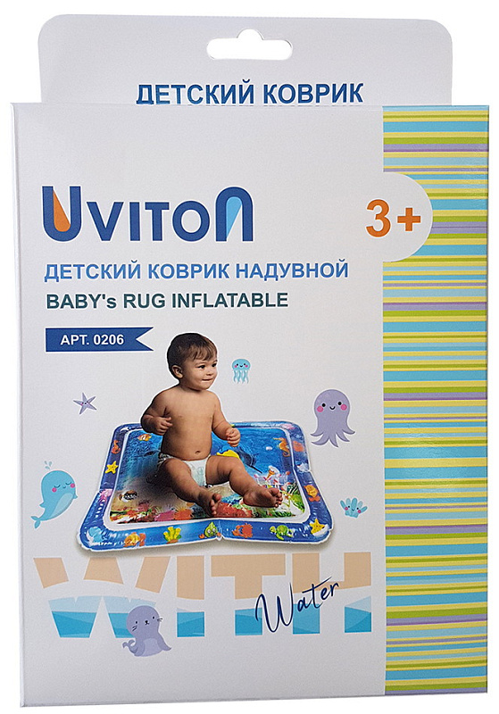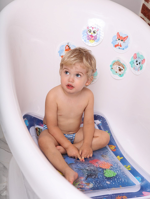 | Коврик Uviton надувной для ванны Ocean Малыши любят купаться, специально для них был разработан развивающий коврик Uviton. Коврик надуваем, наливаем воду комфортной температуры, закрываем плотно крышечку и готово! Можно играть, внутри плавают игрушечные водные обитатели, нарисован красивый дельфин. При выкладывании на животик малыша, на теплый коврик: - малыш учится держать головку., - активно работают мышцы спины, живота, плечевого пояса и шеи., - в позе на животе малыш предпринимает первые попытки начать ползать на четвереньках., - важно выкладывать ребенка на животик перед кормлением для предотвращения кишечных колик., - малыш, смотря на обитателей коврика, концентрирует взгляд на предмете, развивает зрительные навыки., - ловя игрушки развивает хватательные навыки и моторику рук. Большой плюс от такой игры, малыш остается сухим и довольным, а у мамы появляется несколько свободных минут. Размер коврика: 65х48х8 см Характеристики