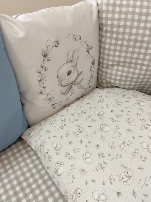 Комплект "Кролик Лаппин"для круглой (овальной) и прямоугольной кроватки, выполнен в сдержанных тонах с использование ткани поплина и сатина, с вышивкой на подушечках с длинноухим, любопытным кроликом.