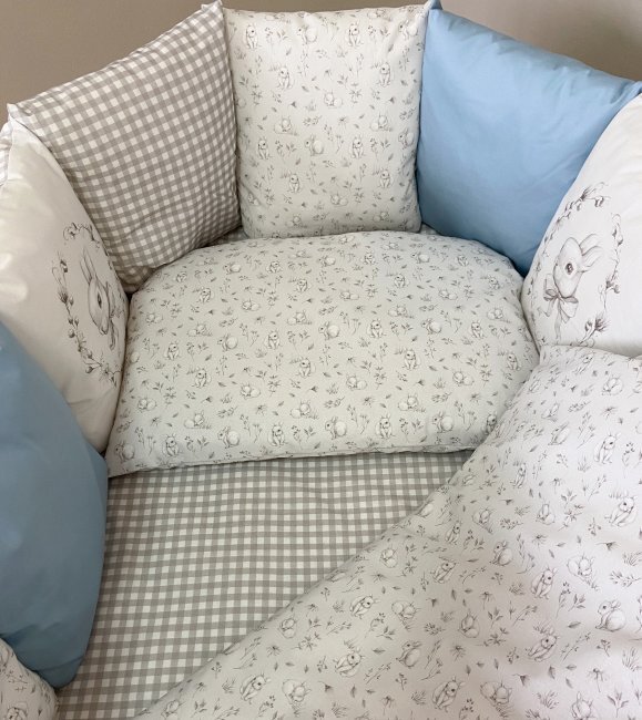 - Бортик из 12 подушечек, 30*30 см, съемные чехлы что делает уход за ним очень простым и удобным. Наполнитель подушечек зашит в дополнительный внутренний чехол и не нуждается в регулярной стирке.