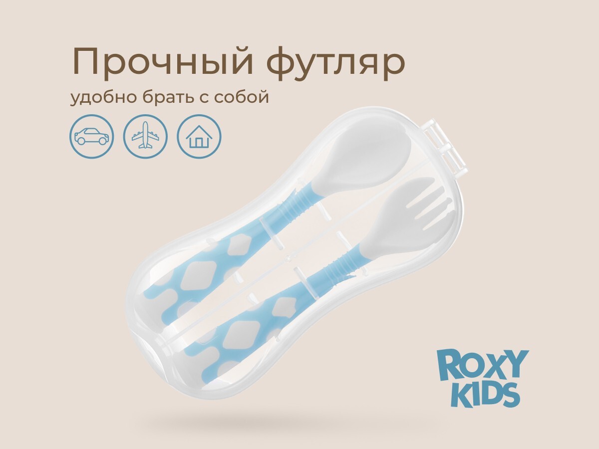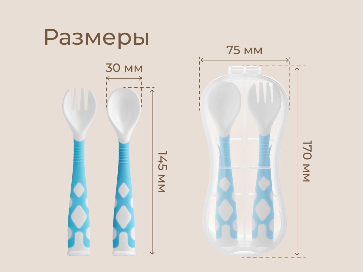 Гибкая ручка – специально для малышей от 9 месяцев, которые только учатся держать ложку. Когда дети ещё не умеют держать столовые приборы по-взрослому, ложку и вилку можно изогнуть так, чтобы им было удобнее схватить ручку целиком в кулачок и поднести еду ко рту. По мере взросления ручки приборов можно разогнуть, чтобы научить ребенка правильно держать любимую ложку. Прочный дорожный кейс для хранения поможет сохранить приборы в чистоте.