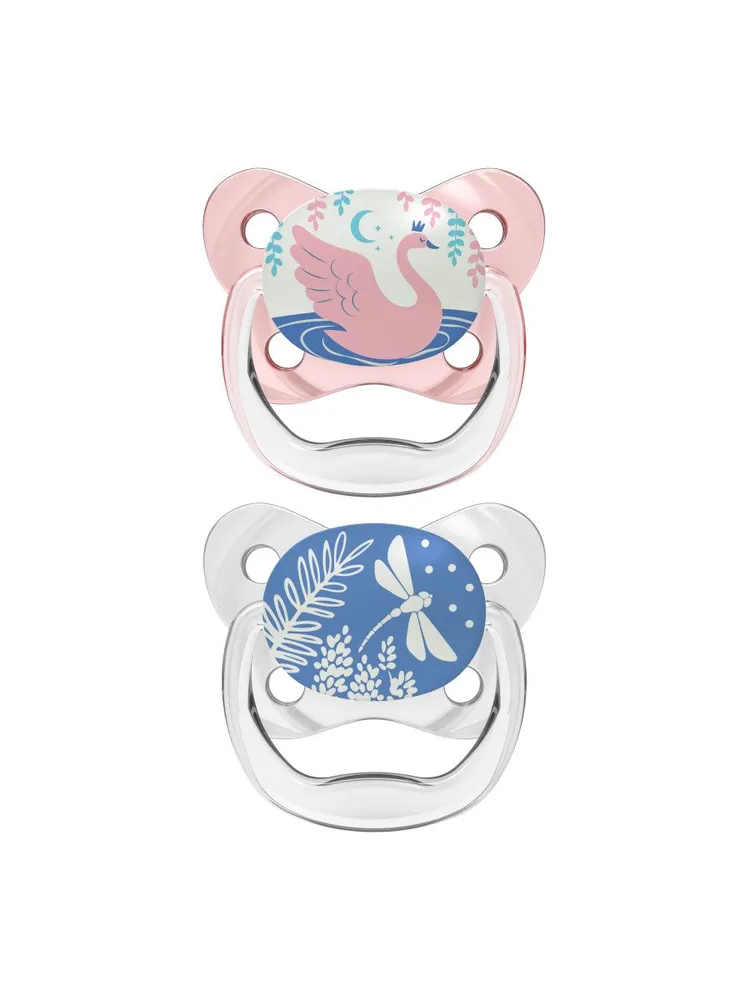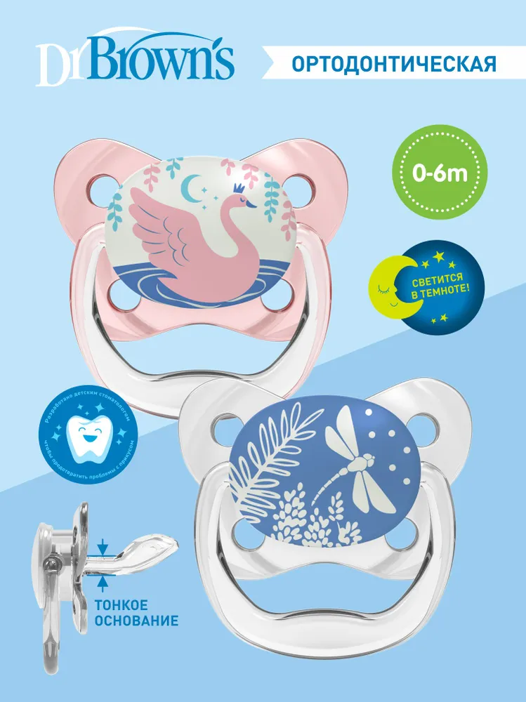 Ночные ортодонтические пустышки Dr. Brown's PreVent от 0 до 6 месяцев с колпачком 2 шт. Соски пустышек изготовлены из силикона: идеального материала без вкуса и запаха, который не вступает в реакцию со слюной и не вызывает аллергии. Соски-пустышки комплектуются защитным колпачком на защёлке и допускают паровую стерилизацию. Рекомендовано в целях гигиены и безопасности заменять пустышки 1 раз в месяц. Воздушный канал ослабляет разрежение в ротовой полости и снижает давление на верхнее нёбо. Мягкая, ослабляющая разрежение грушевидная часть соски при сосании расходится в стороны и не оказывает негативное влияние на верхнее нёбо малыша, тем самым минимизируя риск нарушения прикуса. Основание ортодонтической соски-пустышки PreVent в два раза тоньше, чем у аналогичных пустышек, что уменьшает негативное влияние на зубы и ротовую полость ребенка. В отличие от обычных сосок-пустышек, уникальная соска-пустышка Dr. Brown's не ведёт к нарушению прикуса у детей. Безопасная нетоксичная подсветка упрощает нахождение соски-пустышки в темноте. Для "подзарядки" соски-пустышки достаточно подержать её на свету. Разрешено мыть в верхней корзине посудомоечной машины и стерилизовать в стерилизаторе. Не содержит Бисфенол А и другие вредные примеси. Материал: полипропилен, силикон. Внимание: Не принимайте товар в пункте выдачи, если наклейка целостности упаковки товара сорвана, срезана либо повреждена.
