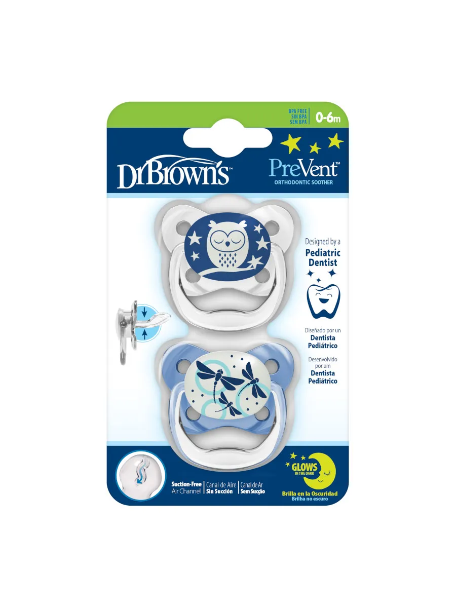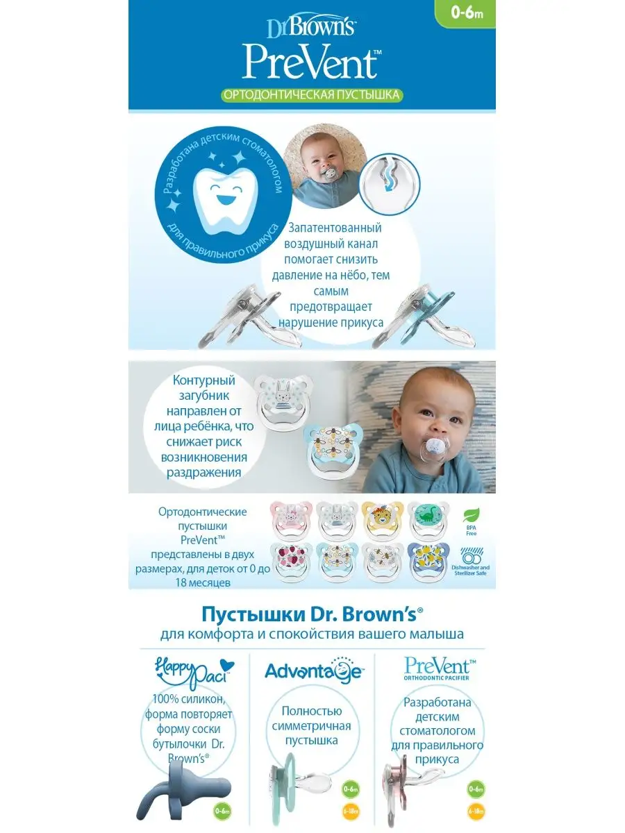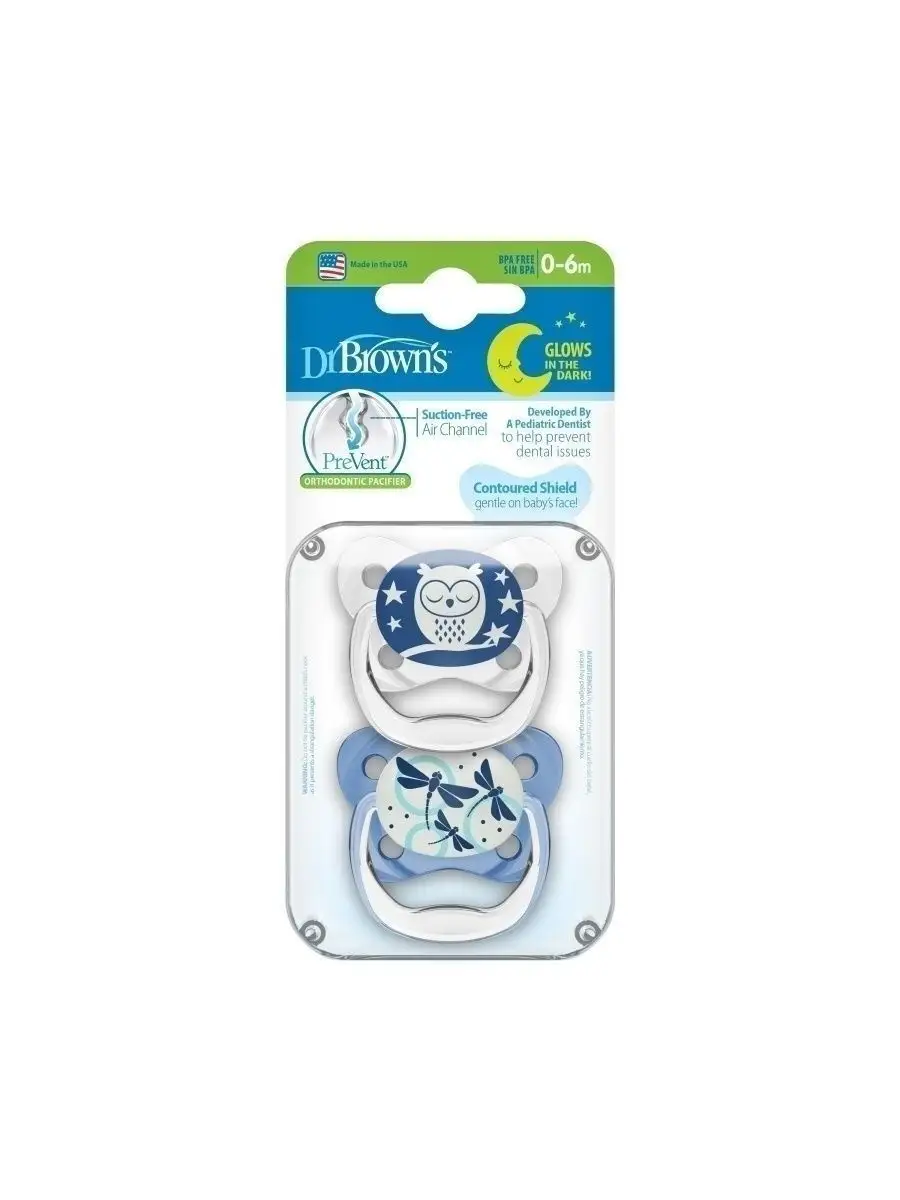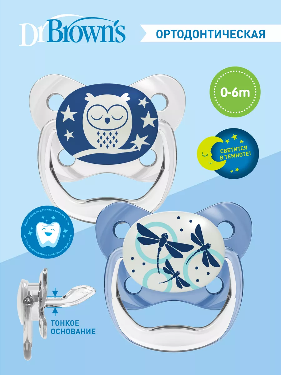 Ночные ортодонтические пустышки Dr. Brown's PreVent от 0 до 6 месяцев с колпачком 2 шт. Соски пустышек изготовлены из силикона: идеального материала без вкуса и запаха, который не вступает в реакцию со слюной и не вызывает аллергии. Соски-пустышки комплектуются защитным колпачком на защёлке и допускают паровую стерилизацию. Рекомендовано в целях гигиены и безопасности заменять пустышки 1 раз в месяц. Воздушный канал ослабляет разрежение в ротовой полости и снижает давление на верхнее нёбо. Мягкая, ослабляющая разрежение грушевидная часть соски при сосании расходится в стороны и не оказывает негативное влияние на верхнее нёбо малыша, тем самым минимизируя риск нарушения прикуса. Основание ортодонтической соски-пустышки PreVent в два раза тоньше, чем у аналогичных пустышек, что уменьшает негативное влияние на зубы и ротовую полость ребенка. В отличие от обычных сосок-пустышек, уникальная соска-пустышка Dr. Brown's не ведёт к нарушению прикуса у детей. Безопасная нетоксичная подсветка упрощает нахождение соски-пустышки в темноте. Для "подзарядки" соски-пустышки достаточно подержать её на свету. Разрешено мыть в верхней корзине посудомоечной машины и стерилизовать в стерилизаторе. Не содержит Бисфенол А и другие вредные примеси. Материал: полипропилен, силикон. Внимание: Не принимайте товар в пункте выдачи, если наклейка целостности упаковки товара сорвана, срезана либо повреждена.