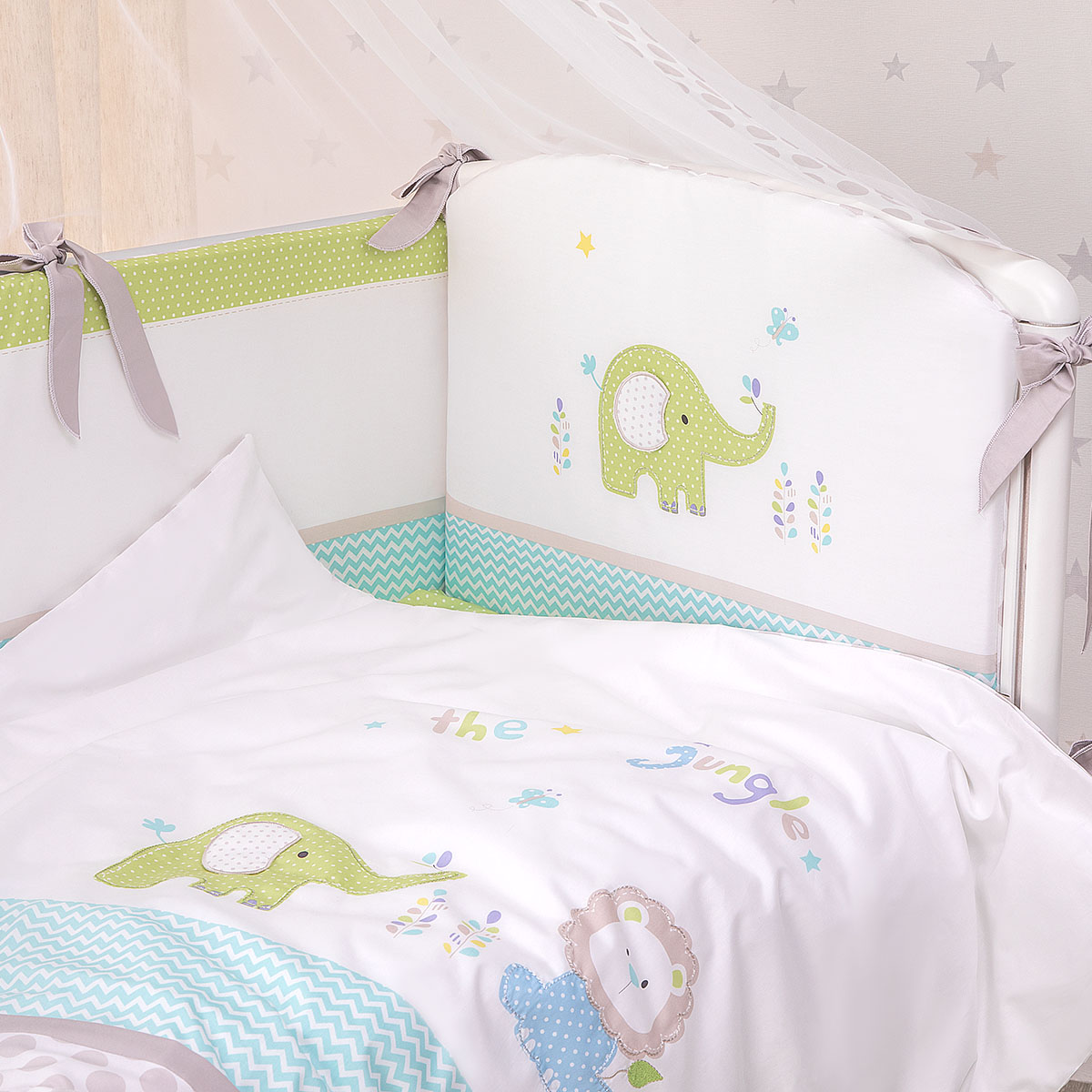 Для дополнительного удобства бампер сделан из отдельных частей со съемным чехлом. Теперь вы легко можете стирать только внешнюю часть бампера, не затрагивая наполнитель. Наполнитель бампера - экологически чистый, гипоаллергенный и легкий материал Hollcon. Этот материал прекрасно сохраняет форму.