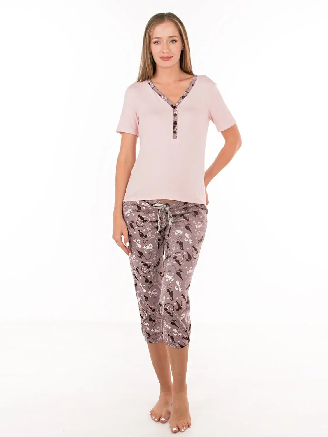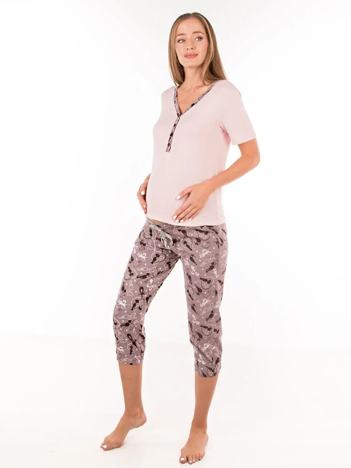 Пижама для беременных и кормящих из натурального хлопка. Футболка с коротким рукавом, на пуговицах. Благодаря глубокому вырезу футболку удобно использовать в период кормления, она хорошо раскрывается и покормить ребенка очень просто. Капри с карманами, на широкой резинке-поясе с дополнительной завязкой. Нижний край свободно собран на резинку. Капри также можно носить после беременности. Поскольку пижама выполнена из натурального хлопка, возможно усадка ткани после стирки и глажки. Стирать в прохладной воде. Домашняя пижама с капри, костюм для беременных и кормящих мам. В комплекте удобная футболка для кормления и капри ( удлиненные шорты) с удобной посадкой под живот. Секрет кормления на футболке.