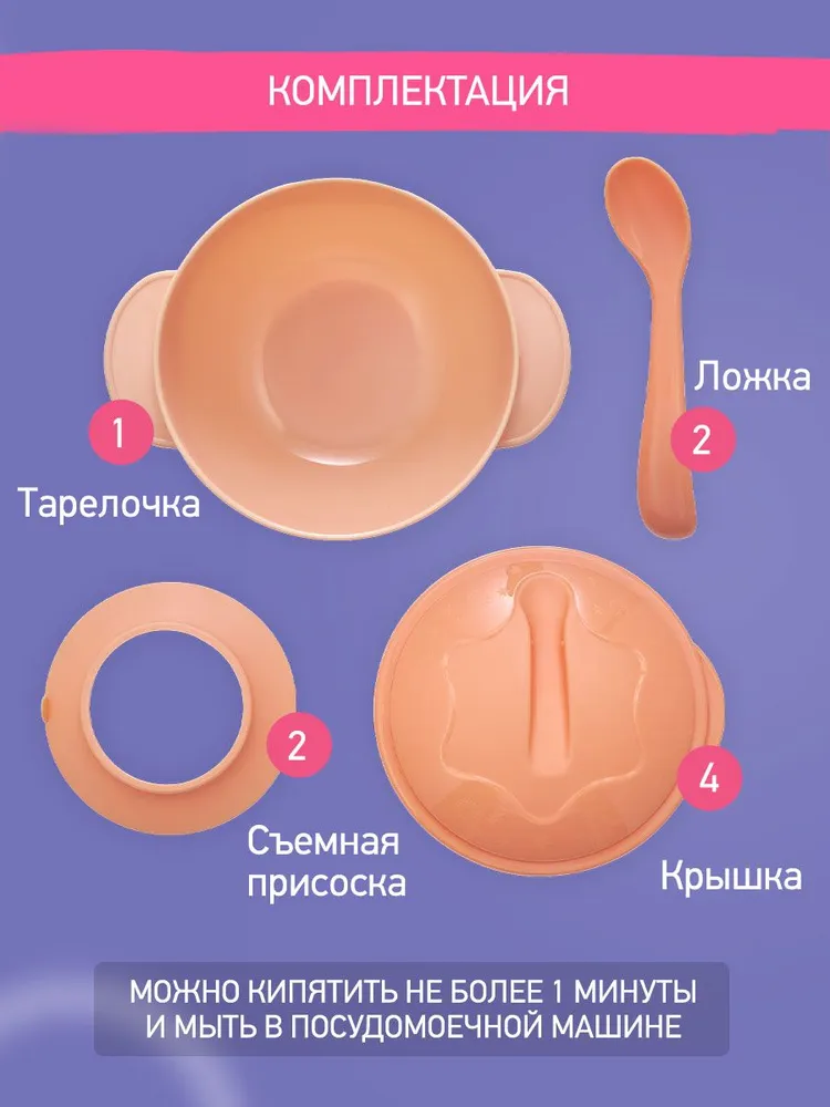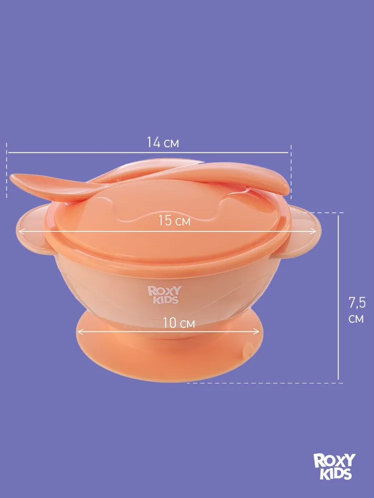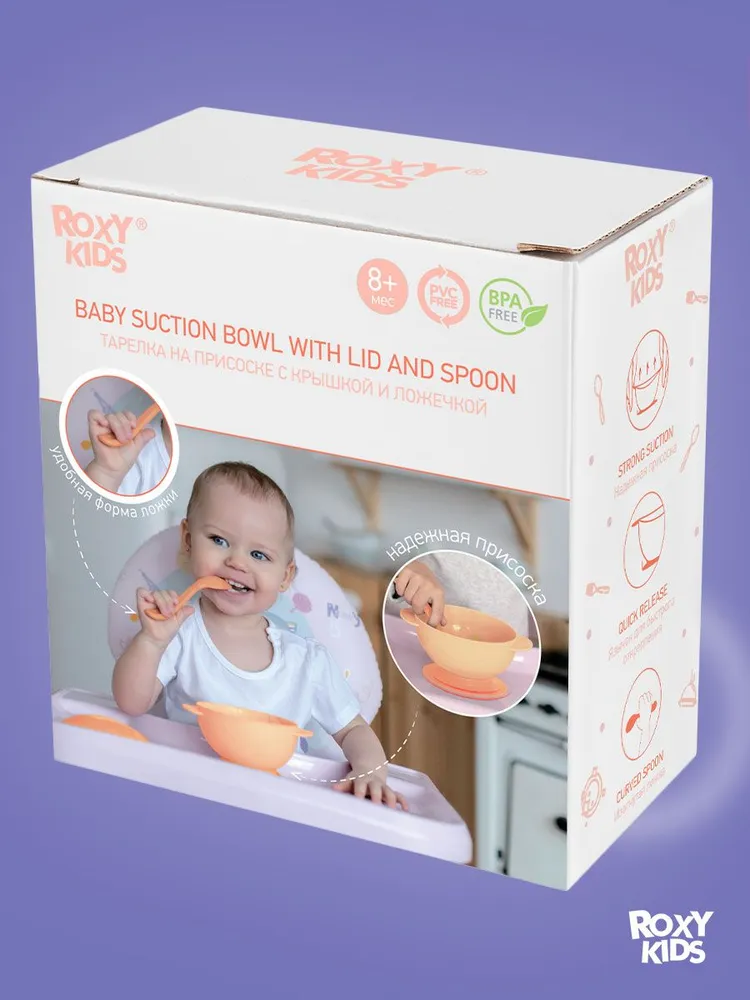Детская тарелочка на присоске ROXY-KIDS поможет приучить ребенка к самостоятельному приему пищи и сделает процесс кормления легким и приятным! Тарелка легко крепится к столу или стульчику для кормления и останется на месте, даже если малыш совершит неосторожное движение рукой. Специальный язычок помогает легко открепить изделие от поверхности. Плоская и изогнутая форма ложки идеально подходит для малыша, который только учится пользоваться столовыми приборами. Крышка плотно закрывается для транспортировки, а ложка удобно крепится на крышку и не теряется. Большой диаметр и глубина тарелочки подходят для жидких каш и пюре. Изделие выполнено из высококачественного пищевого материала, имеет закругленные края и абсолютно безопасно для малыша!