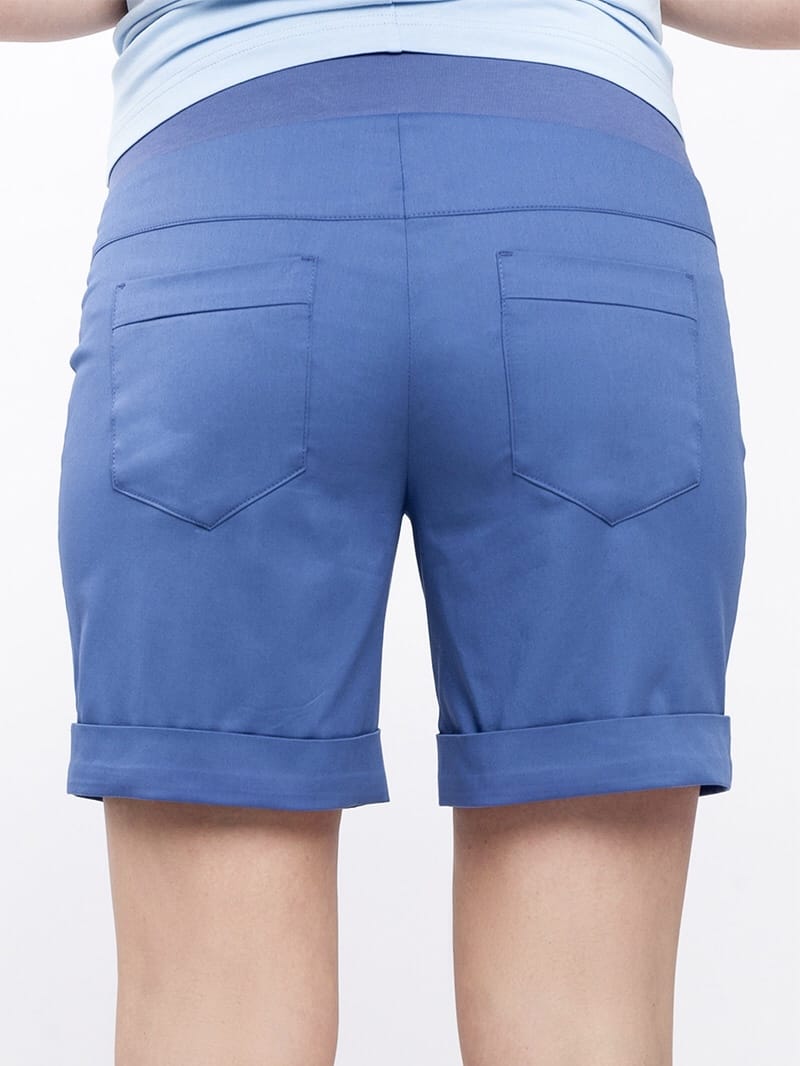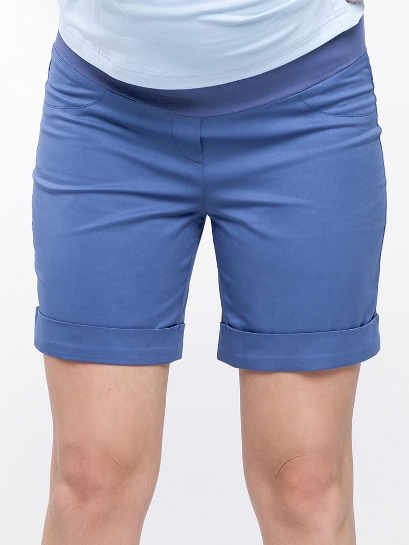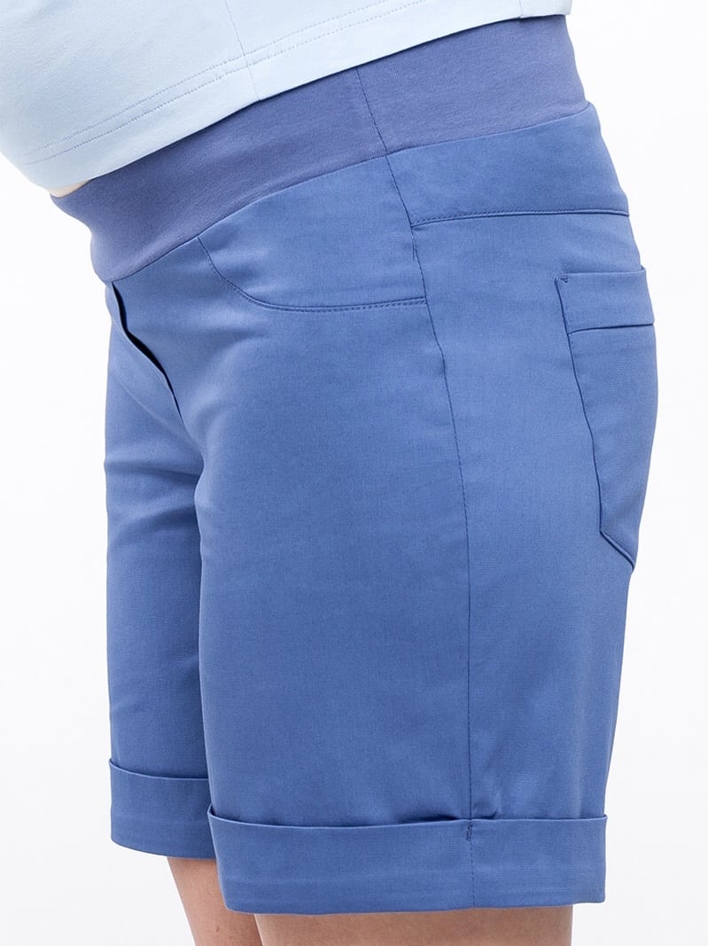 Базовые шорты для беременных в джинсовом стиле. Силуэт: средней свободы, с манжетами. Тип пояса: бандажный (можно носить и после беременности). Карманы: сзади накладные карманы, впереди — обманка. Ткань: тонкий стрейчевый материал из смеси хлопка и вискозы.